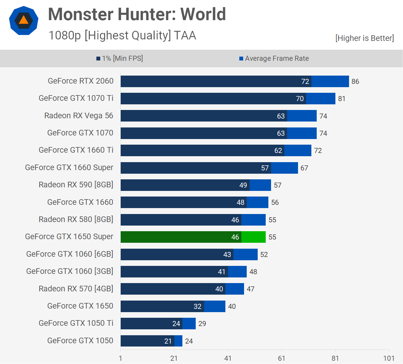 Monster Hunter: World voit le 1650 Super augmenter de 38% ses performances par rapport au modèle 1650 standard, qui a vu la fréquence d’affichage moyenne passer de 40 à 55 images par seconde, et c’est là une amélioration importante que vous remarquerez certainement.