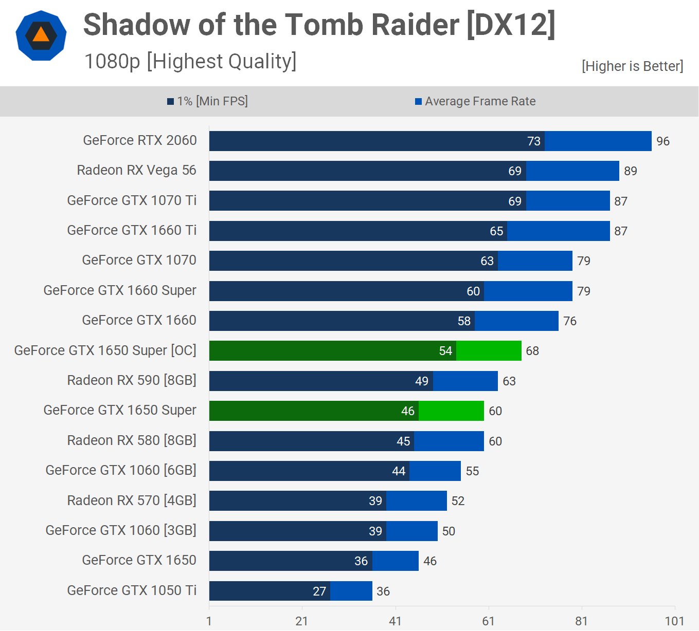 Nous constatons également une amélioration substantielle des performances de 13% dans Shadow of the Tomb Raider. Ici, le 1650 Super overclocké a généré en moyenne 68 ips, ce qui le rend 11% plus lent que la GTX 1660 de série.