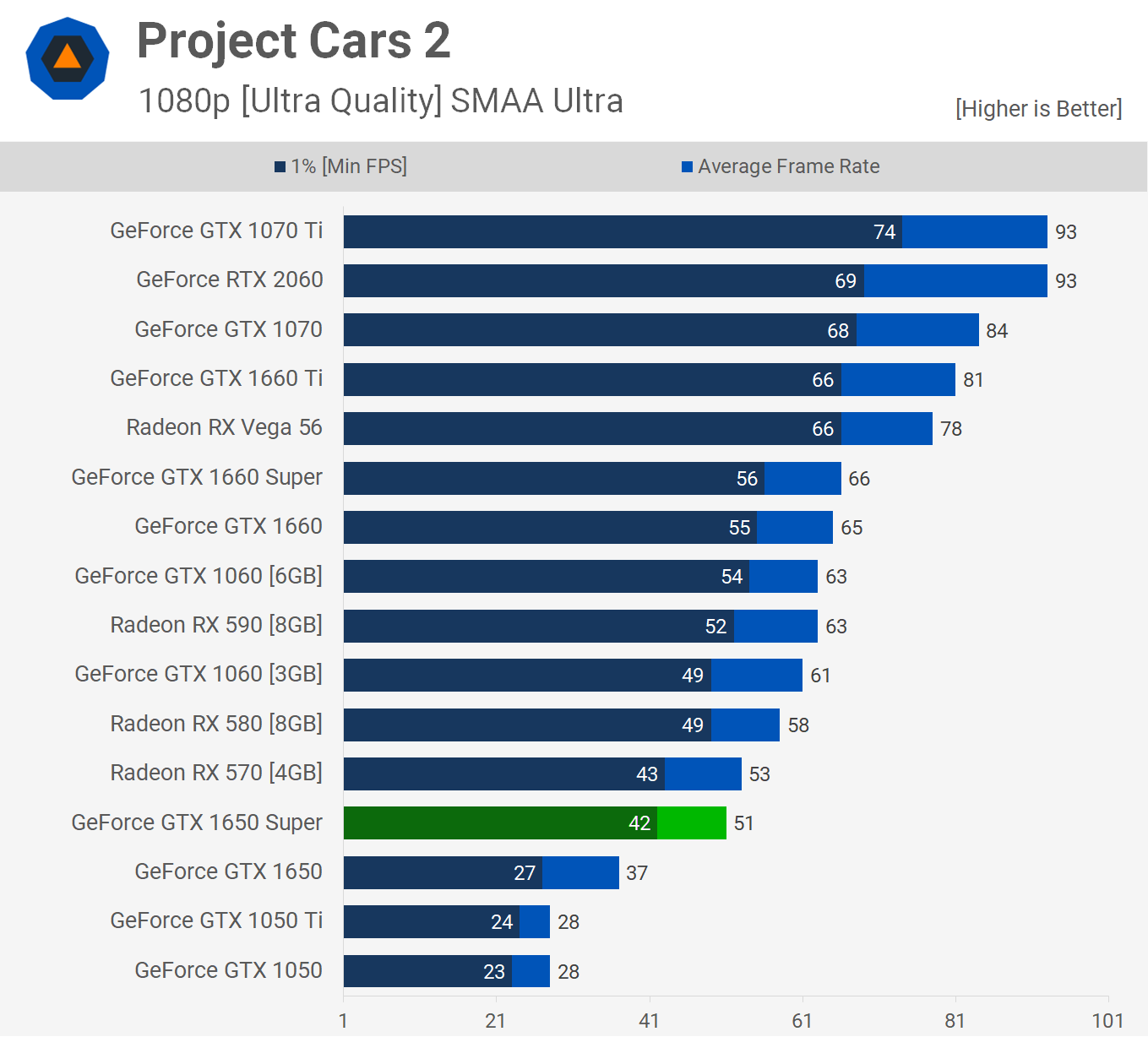 Les GPU abordables de Radeon ont toujours un avantage dans Project Cars 2. Ici, le 1650 Super n’a en moyenne que 51 ips, ce qui le rend plus lent que même le RX 570, et ce malgré une amélioration de 38% des performances par rapport au 1650 standard.