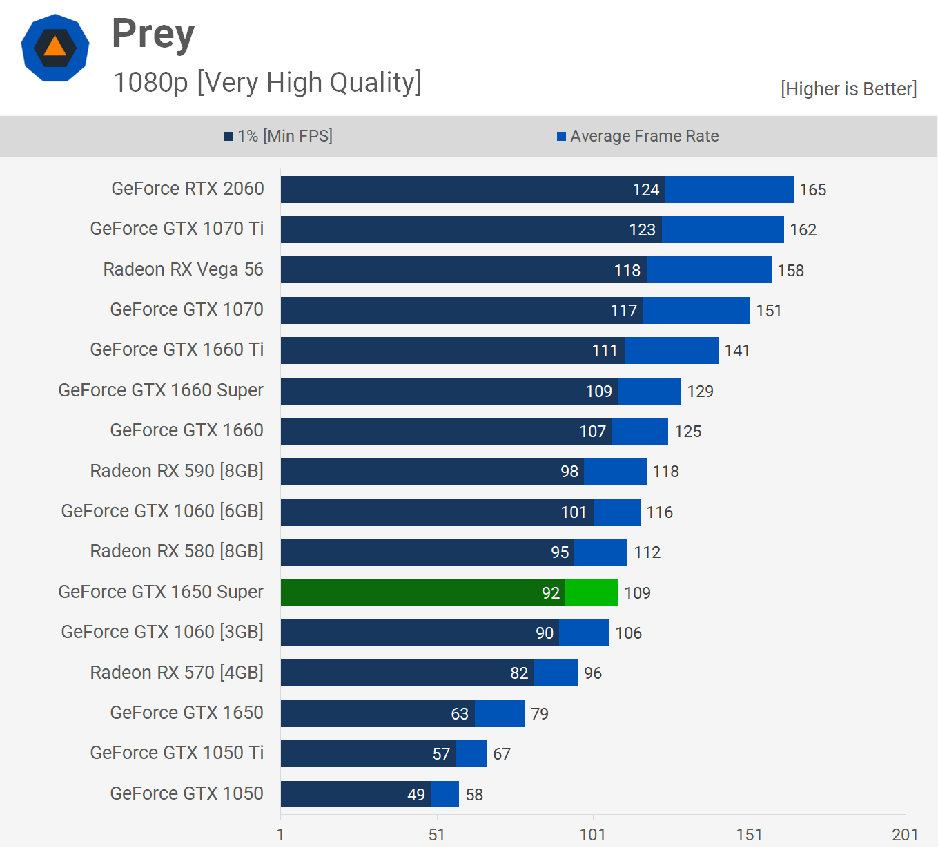 Nous sommes revenus à d’importants gains de performances, cette fois lors des tests avec Prey. Ici, la 1650 Super était 38% plus rapide que la 1650 standard, affichant 109 fps en moyenne, ce qui la plaçait à quelques images seulement du RX 580 et 13% moins rapide que la GTX 1660.