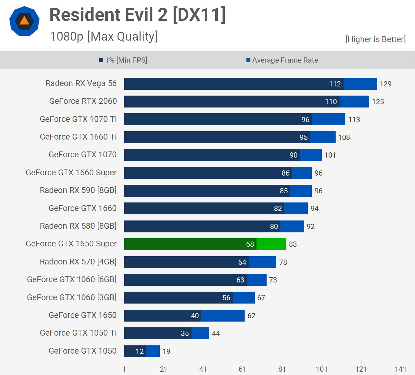 Ensuite, nous avons Resident Evil 2 et le 1650 Super n’a aucun problème à offrir une performance jouable en douceur avec une moyenne de 83 images par seconde. Cela le rendait 33% plus rapide que la norme 1650 et 6% plus rapide que le RX 570, bien que cette fois, il était 12% moins rapide que la GTX 1660.