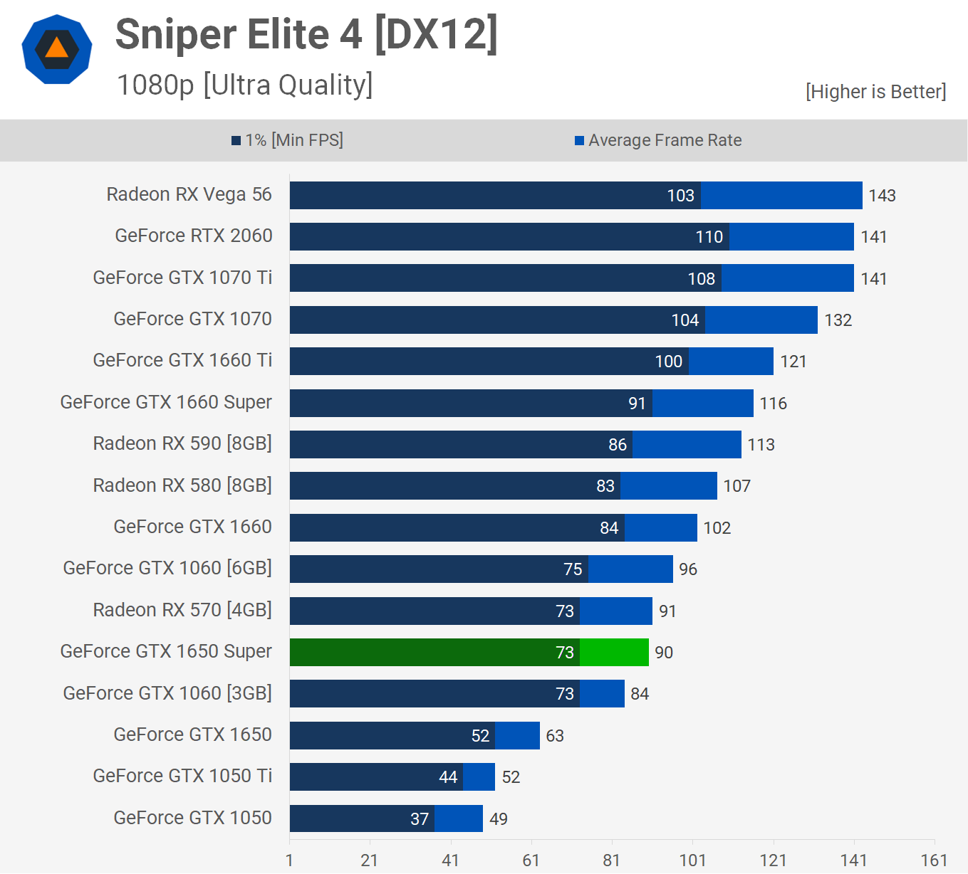 Bien que le Super 1650 ne corresponde qu'à la Radeon RX 570 de Sniper Elite 4, il était tout de même 43% plus rapide que le 1650 standard, portant le taux de trame moyen de 63 ips à 90 ips.