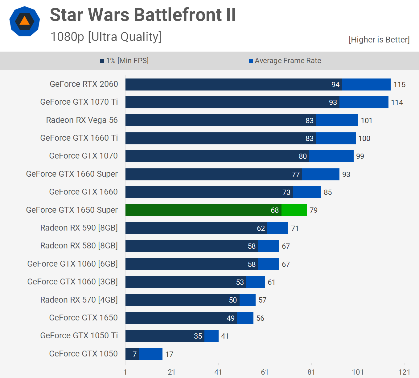 Les performances de Star Wars Battlefront II sont très impressionnantes. Non seulement la 1650 Super est-elle 41% plus rapide que la GTX 1650, elle est également 11% plus rapide que le RX 590 et seulement 7% plus lente que la GTX 1660, ce qui donne un résultat remarquable.