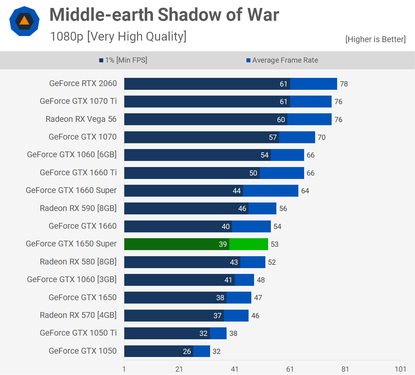 Enfin, nous avons Shadow of War et, comme ce fut le cas avec The Witcher 3 Wild Hunt, nous constatons que la 1650 Super est capable d’égaler la GTX 1660. Bizarrement, elle n’était que 13% plus rapide que la vanille GTX 1650 et c’est le plus petit. marge nous avons vu dans ces tests, donc des marges très inattendues dans ce jeu.
