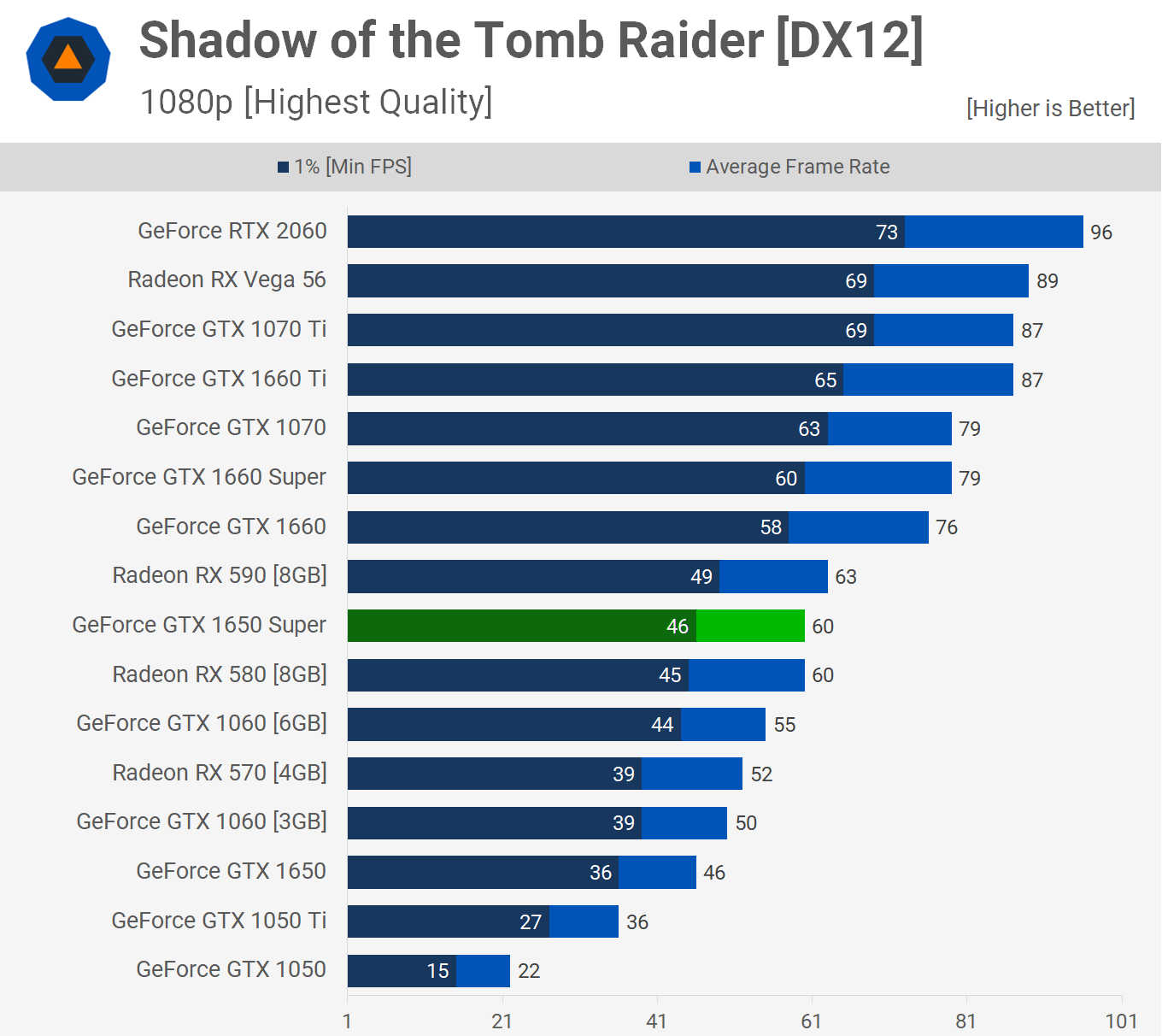 Premièrement, nous avons Shadow of the Tomb Raider et, ici, la 1650 Super en moyenne à 60 ips, ce qui la place à égalité avec le RX 580 et devant la GTX 1060. Cela l’a également rendue 30% plus rapide que la 1650 vanille. et cela signifie que vous n'aurez pas besoin de baisser les paramètres de qualité dans ce titre.