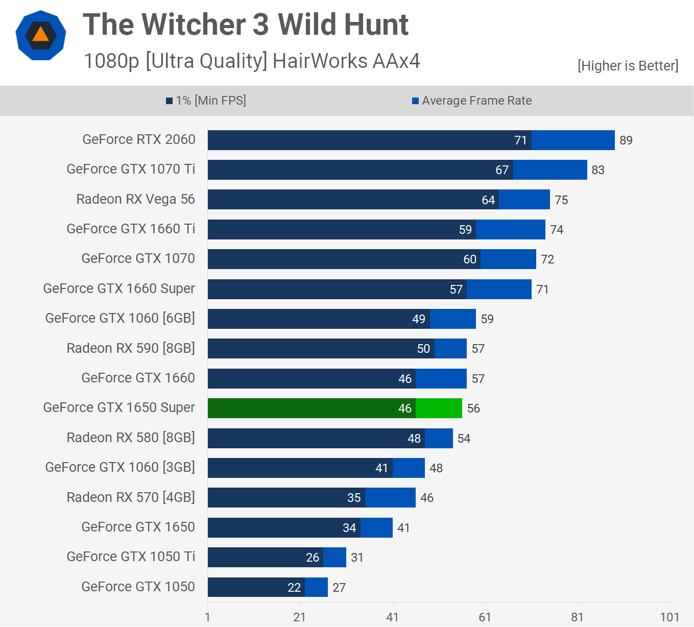 Les résultats de Witcher 3 Wild Hunt sont intéressants, le 1650 Super est 37% plus rapide que le 1650 standard, ce qui est assez standard, étant donné ce que nous avons vu jusqu’à présent. Cependant, elle peut également égaler les performances de la GTX 1660 standard dans ce titre, et ce n’est pas quelque chose que nous avons vraiment vu dans les autres jeux déjà testés.