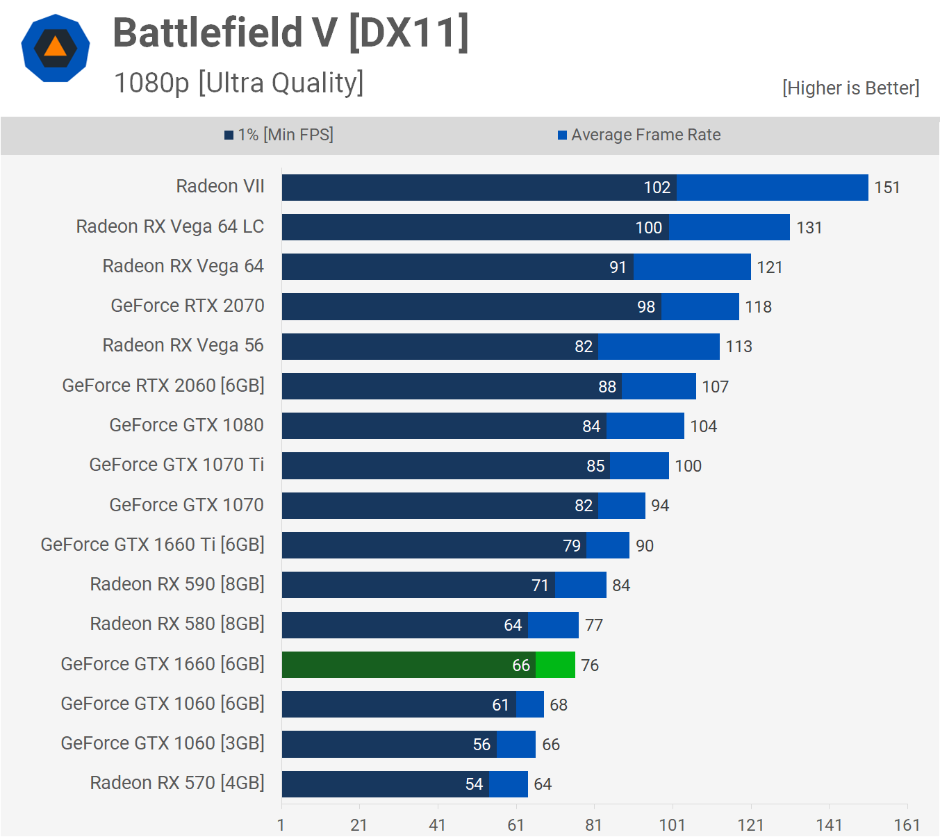 Lors des tests avec Battlefield V, le modèle 1660 est devancé de 16% par le modèle Ti. Il n'a réussi à égaler que le RX 580. Les GPU Radeon se comportent très bien dans ce titre. Par rapport à la GTX 1060 6 Go, nous envisageons une hausse des performances inférieure à 12%.