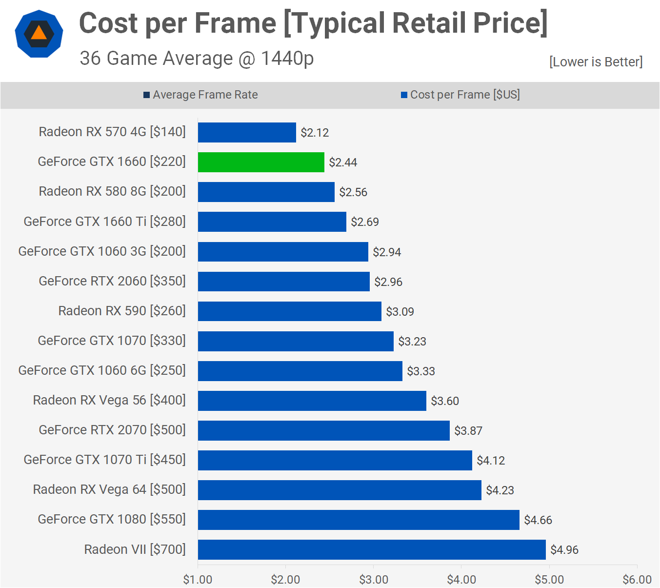 Cela laisse le coût par image de 140 RX 570 d’AMD, mais comme vous pouvez le constater, la GTX 1660 était en moyenne plus rapide de 36%. Par conséquent, payer un peu plus pour toutes ces performances supplémentaires en vaudra la peine.
