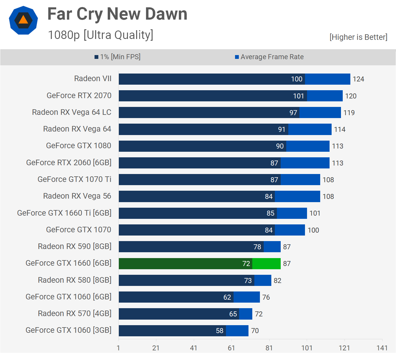 Lors des tests avec Far Cry New Dawn, la GTX 1660 correspondait à nouveau au RX 590. Avec une moyenne de 87 fps, les performances en 1080p étaient excellentes, bien qu’elles soient 14% plus rapides que les 1060 6 Go. Le GPU plus ancien de Pascal produisait en moyenne 76 images par seconde. La différence n’était donc pas aussi perceptible.