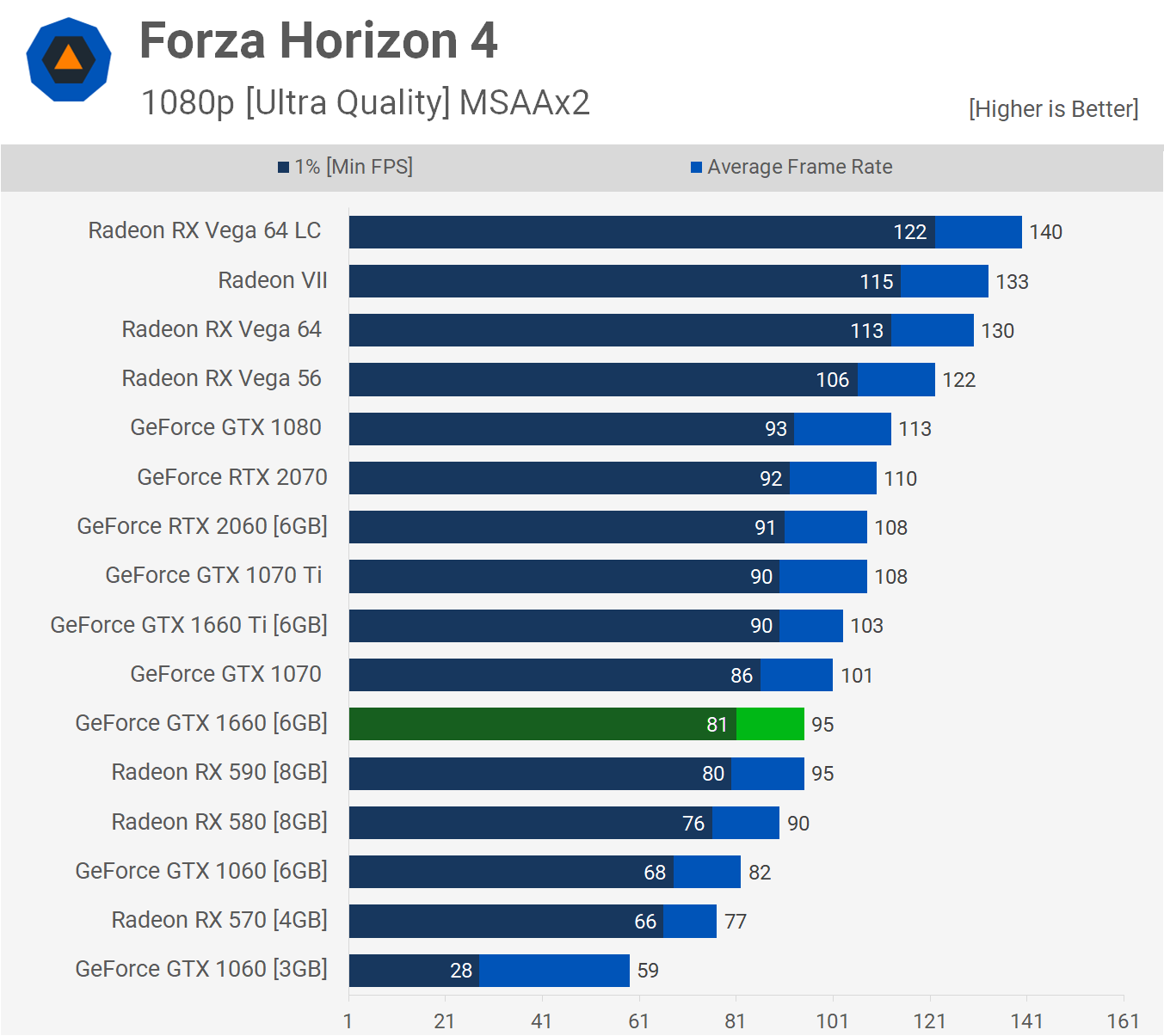 La GTX 1660 n’est pas aussi impressionnante dans Forza Horizon 4, où elle correspondait à celle du RX 590 et n’était que légèrement plus lente que la GTX 1070. Par rapport à la GTX 1060 6 Go, elle était 16% plus rapide, ce qui n’est pas mauvais, mais pas excellent non plus.