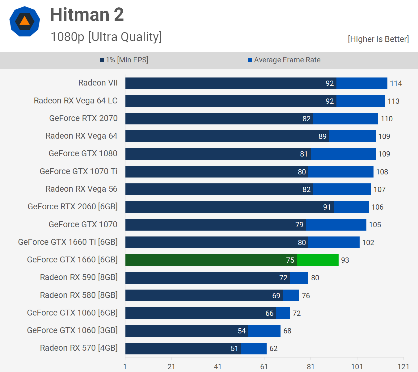Hitman 2 est un jeu limité en CPU à 1080p lorsque vous utilisez la GTX 1660 Ti ou supérieure. Nous constatons que la 1660 n’est pas tout à fait à la limite du processeur mais elle reste quand même 16% plus rapide que le RX 590 et 29% plus rapide que la GTX 1060 6 Go. Hitman 2 est un titre quelque peu étrange, mais le 1660 se comporte bien malgré tout.