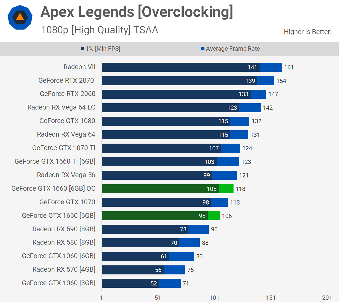 Des tests avec Apex Legends montrent que la GTX 1660 offre une belle augmentation de 28% de ses performances par rapport à la 1060 6 Go, avec une moyenne remarquable de 106 images par seconde à 1080p. La carte était 6% moins rapide que la GTX 1070 et 14% plus lente que la GTX 1660 Ti, qui sont des marges relativement étroites.