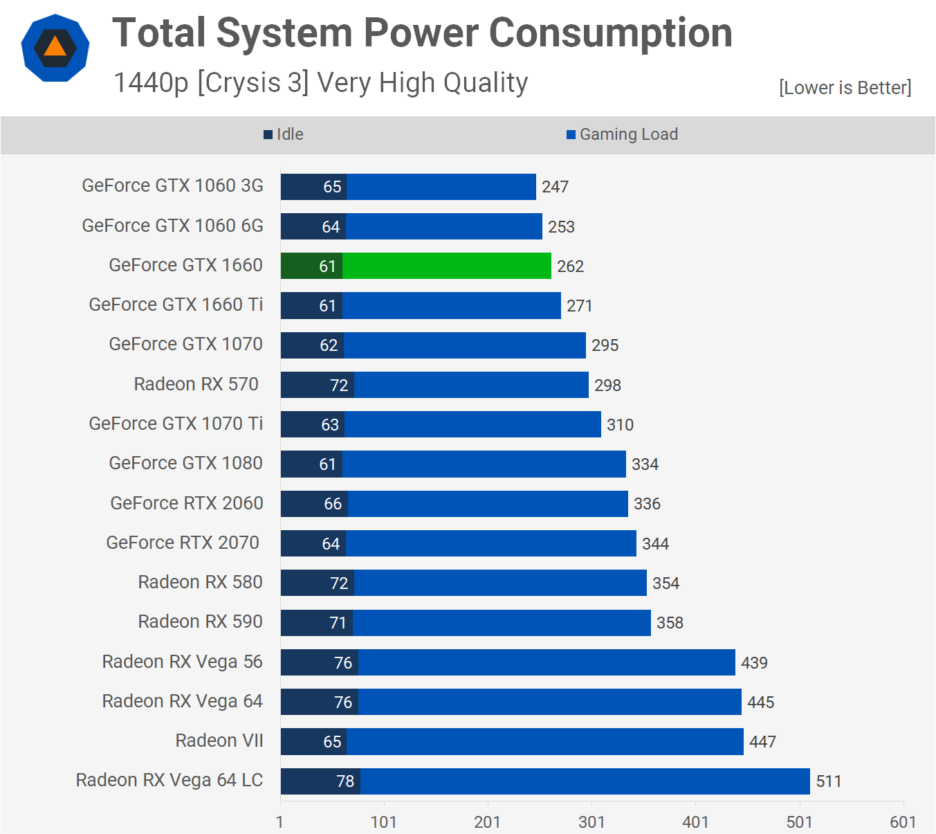 En termes de consommation électrique, nous pouvons constater que la nouvelle GTX 1660 est extrêmement économe en carburant, tout comme son frère Ti. La carte a poussé la consommation totale du système au même niveau que la GTX 1060 6 Go, déjà très efficace, tout en offrant davantage de performances. En termes d’efficacité, la GTX 1660 est excellente.