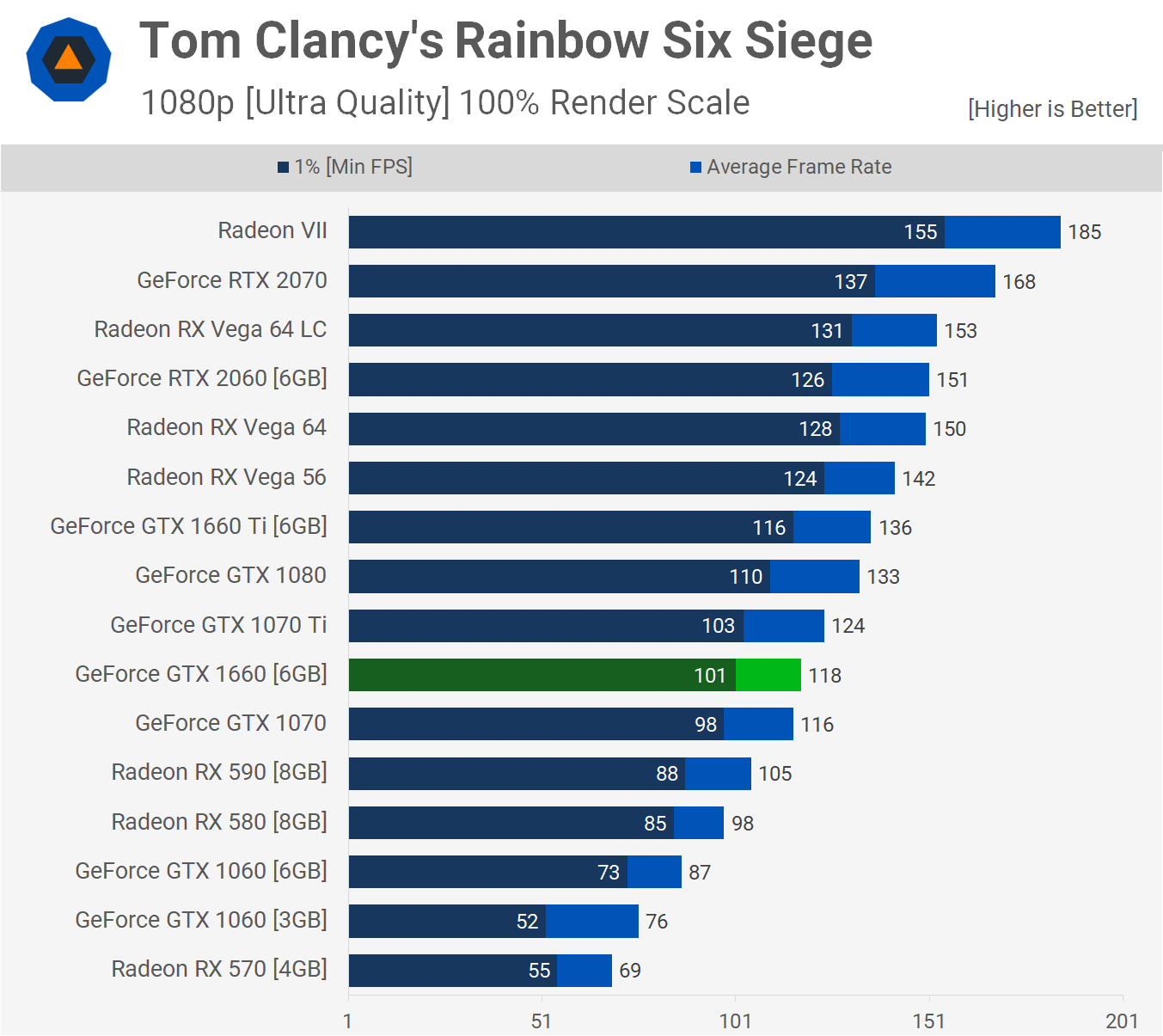 Nous avons déjà vu que Turing aime Rainbow Six Siege ou Rainbow Six Siege aime Turing. Quoi qu’il en soit, c’est une bonne nouvelle pour les futurs propriétaires de la GTX 1660. Ici, le nouveau GPU à budget a généré une incroyable moyenne de 1080 images par seconde en 1080p avec une échelle de rendu de 100%. Cela représente une amélioration considérable de 36% des performances par rapport à la GTX 1060 6 Go.