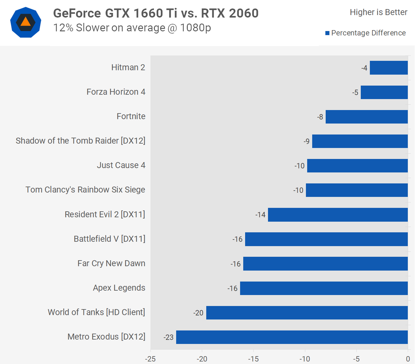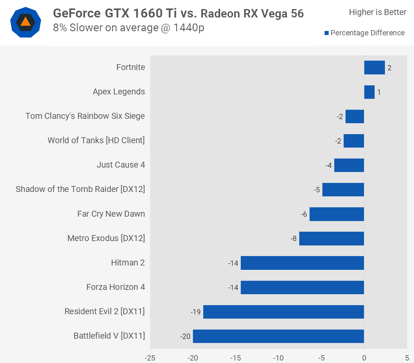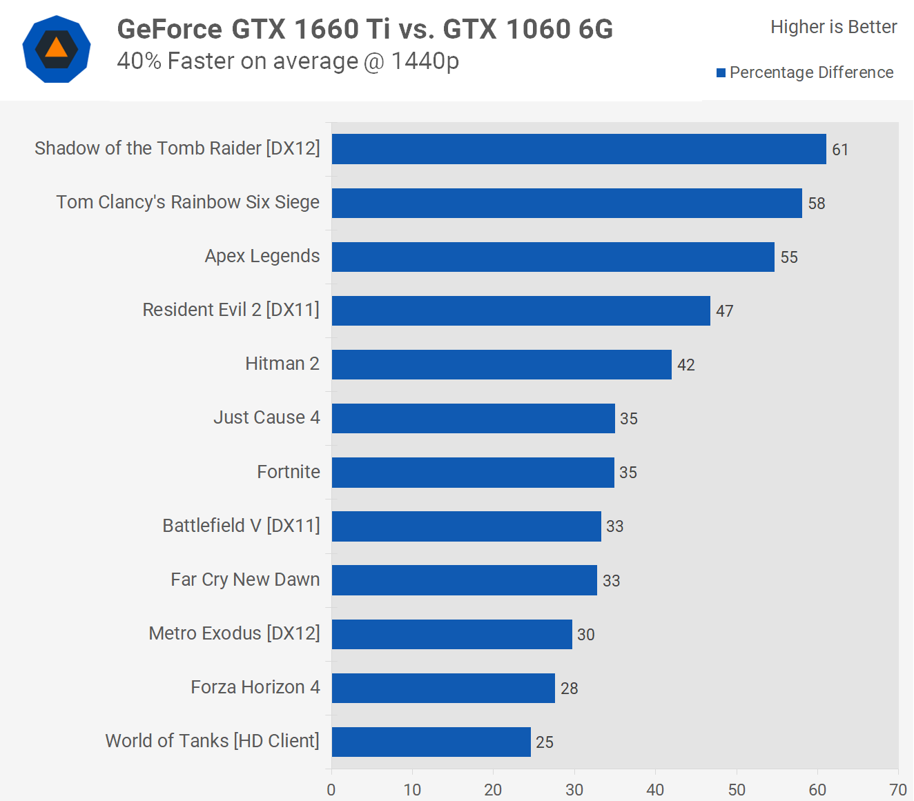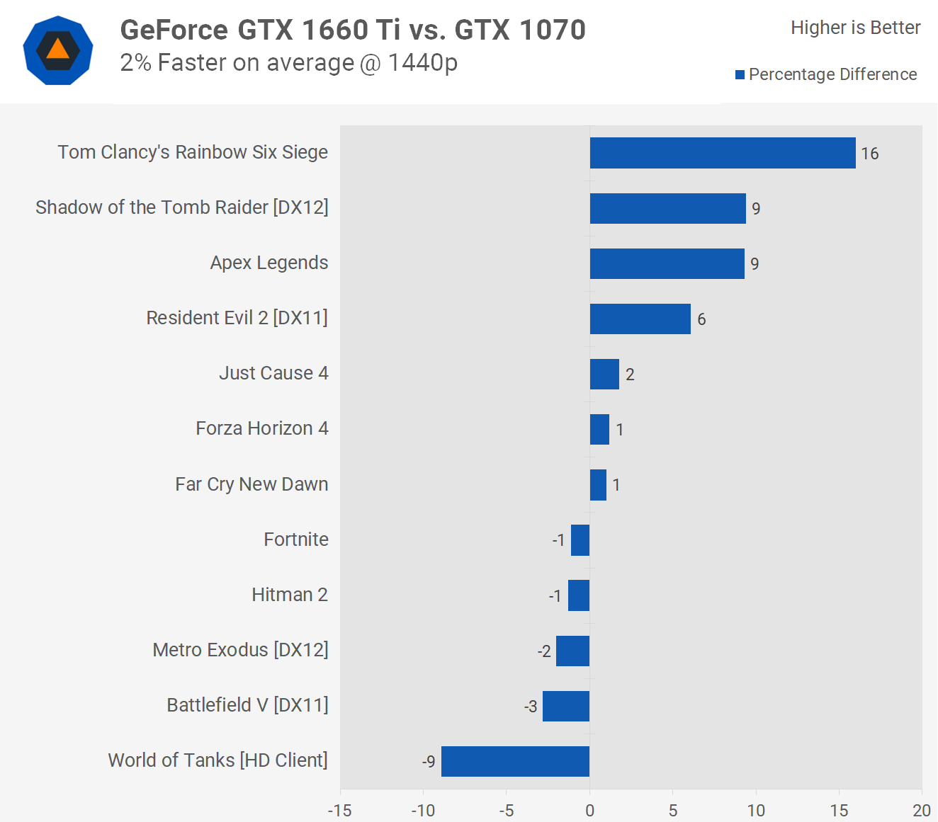 Celui-ci a été appelé tout au long de l'examen et des résultats de référence. Vous savez donc que la GTX 1660 Ti est en quelque sorte la nouvelle GTX 1070. Les performances varient légèrement dans quelques titres, mais la plupart du temps, il s'agit d'un seul chiffre. différence de performance. Nous constatons la même différence de performance de 2% à 1440p.