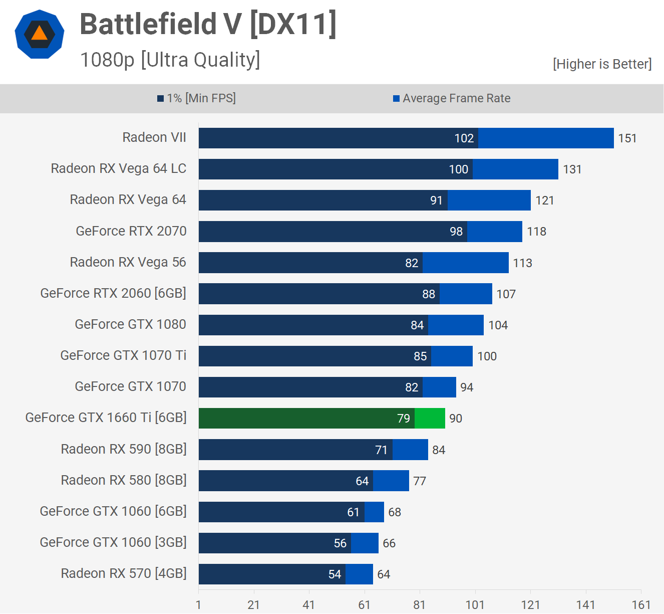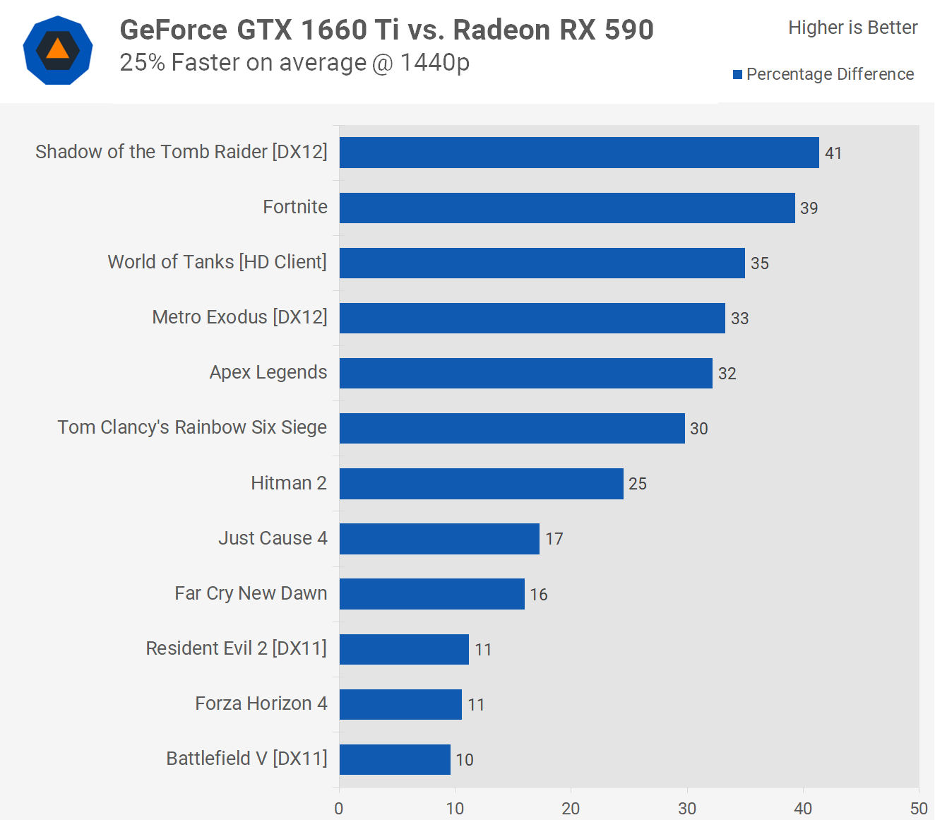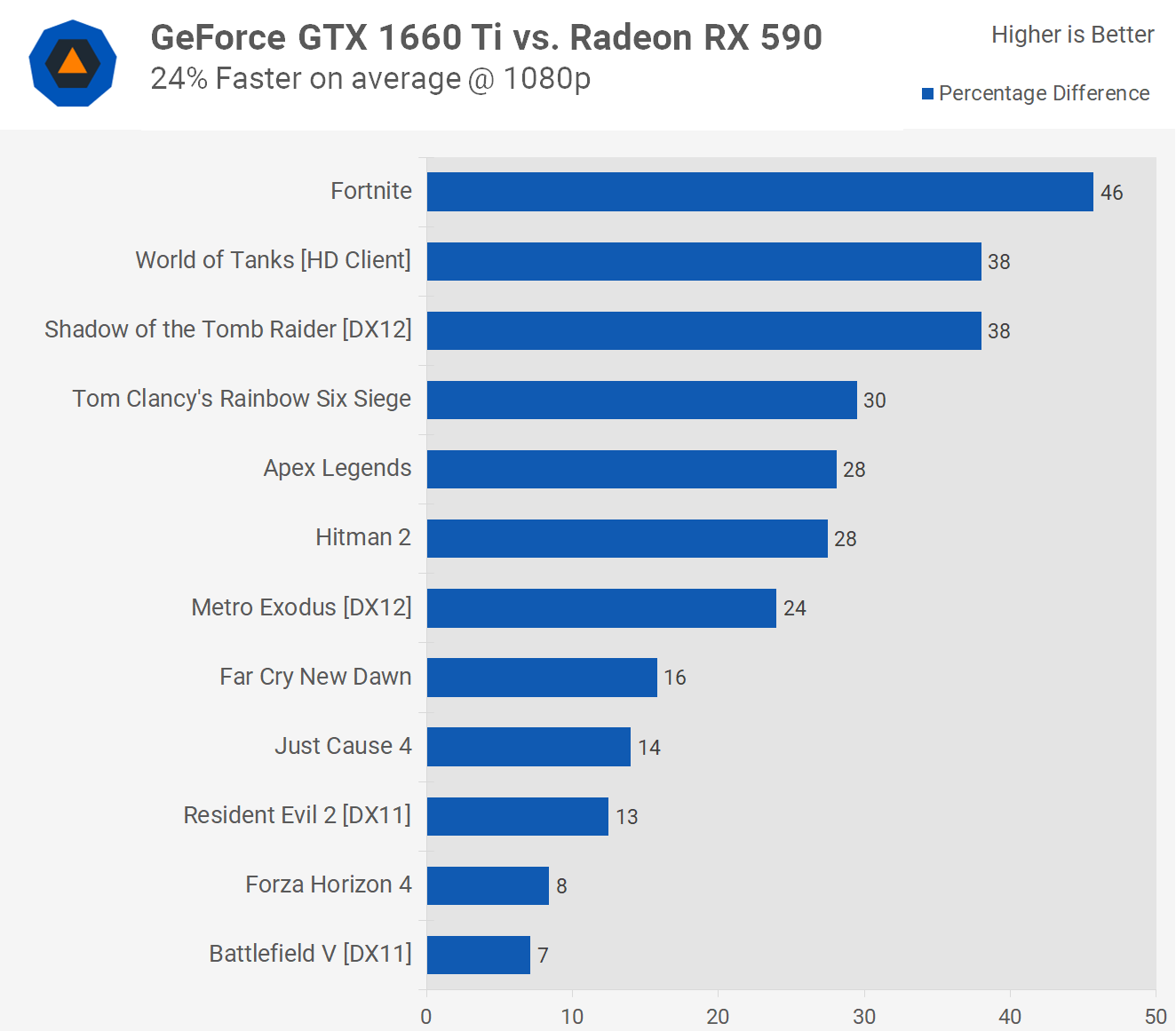 Par rapport au RX 590, dont le prix est similaire, la GTX 1660 Ti est 24% plus rapide.