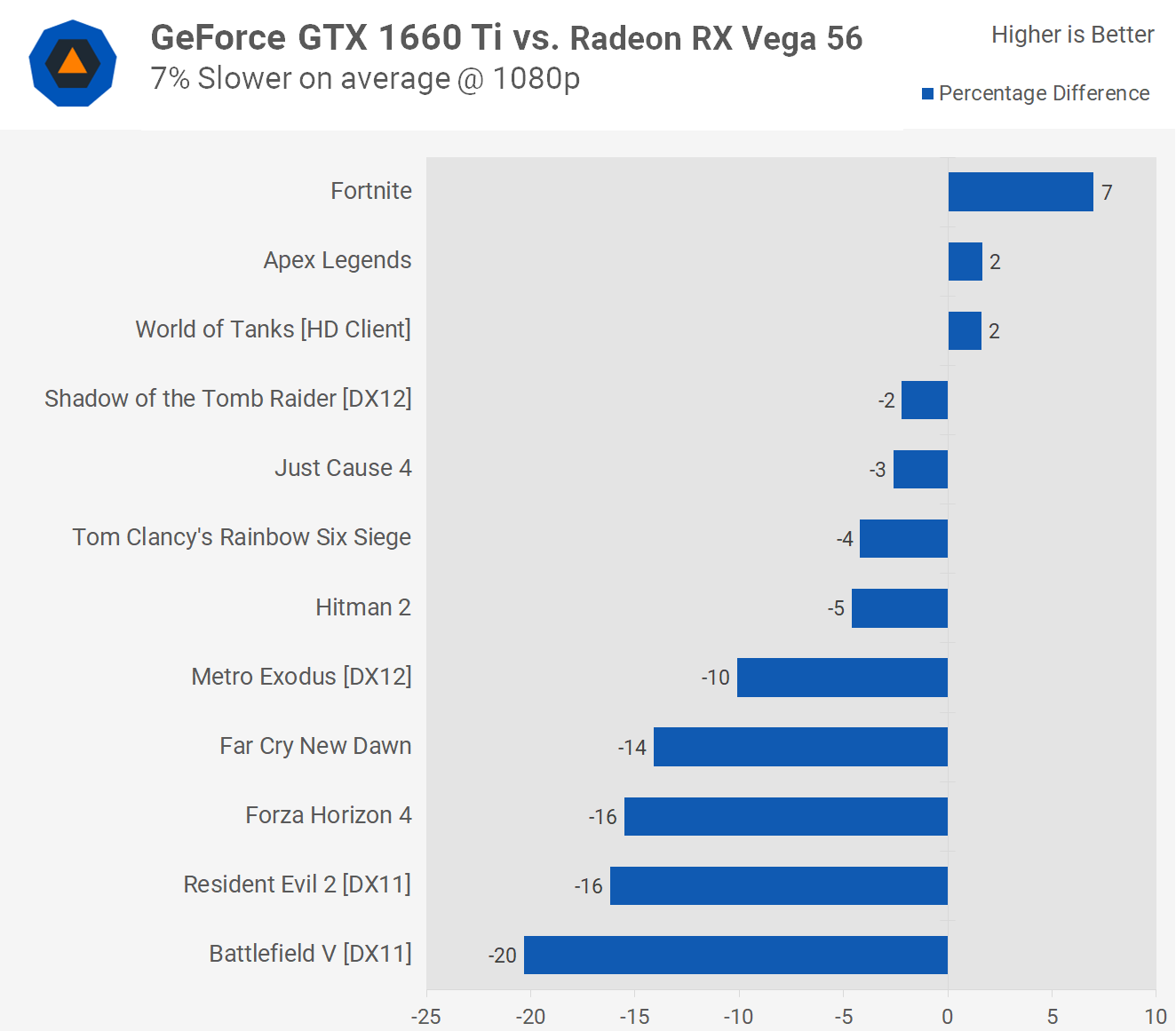Depuis que nous avons examiné le RX 590, nous avons indiqué que la tarification de ce processeur graphique n’était pas correcte et qu’elle n’avait pas un bon rapport qualité-prix, mais à présent, AMD sera forcée de faire des ajustements. La nouvelle 1660 Ti vous offre 24% de performances en plus pour une hausse de prix de 8%. De plus, dans le pire scénario de jeu, la 1660 Ti était toujours 7% plus rapide que le RX 590, mais dans le meilleur des cas jusqu'à 46% plus rapide. C’est donc clairement le meilleur achat.
