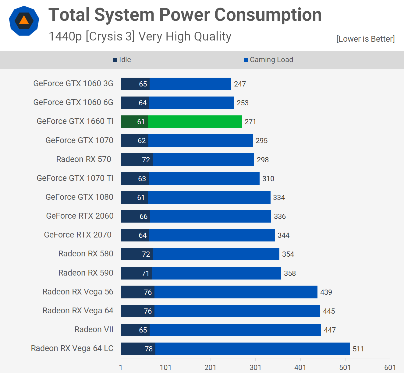 En termes de consommation électrique, la GTX 1660 Ti a poussé la consommation totale à 271 watts, ce qui la rend très efficace. En substance, vous obtenez des performances similaires à celles de la GTX 1070 pour une économie d’énergie de 8% pour l’ensemble du système.