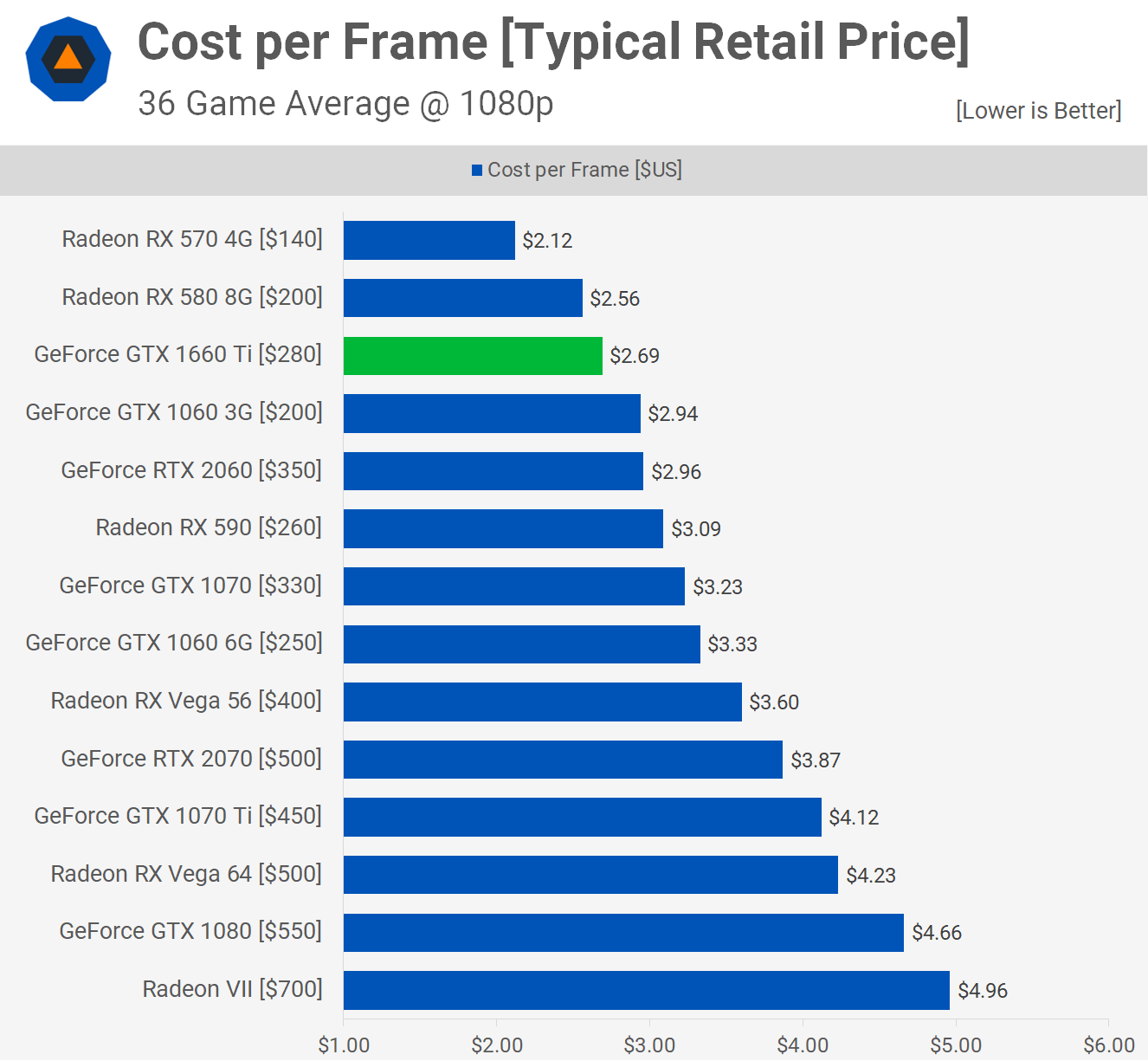 La GeForce GTX 1660 Ti est un niveau entier supérieur à celui du RX 580. Il est donc tout simplement fantastique que ce GPU offre un coût similaire par image.