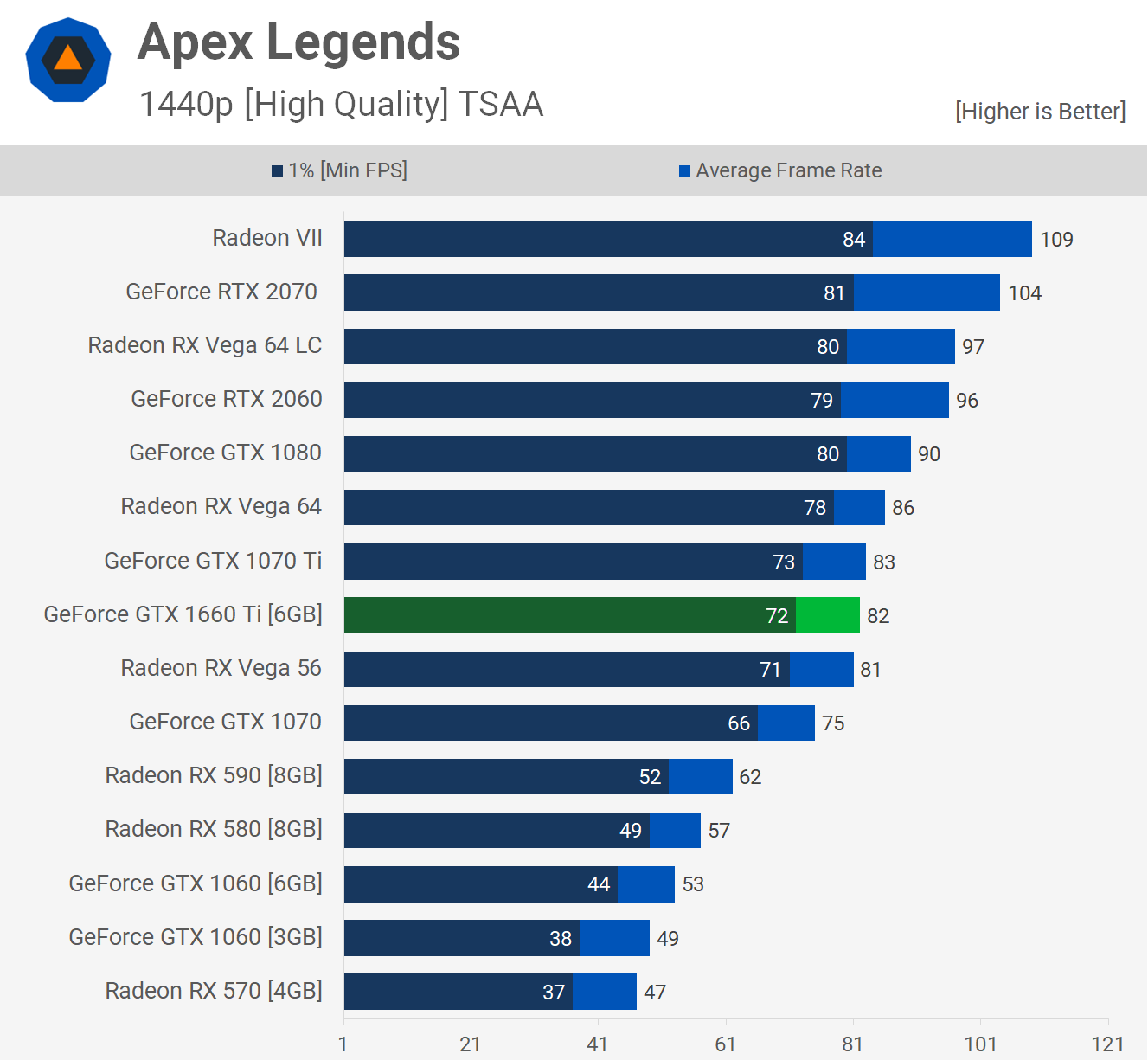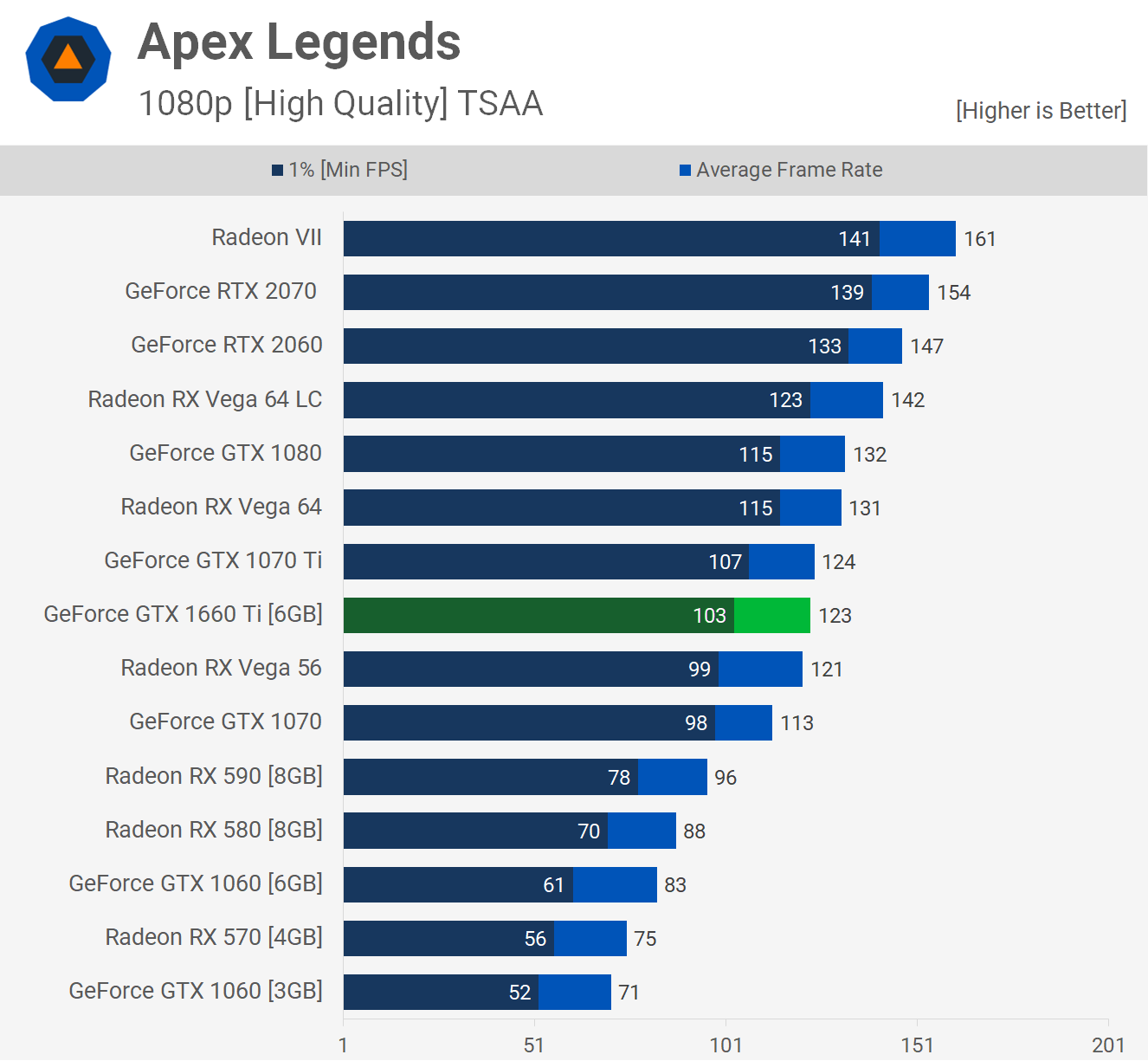 Nouveau titre de bataille royale ultra populaire en ville, nous avons testé Apex Legends avec la nouvelle GTX 1660 Ti. La carte a généré 123 images par seconde à 1080p, ce qui la rend plus rapide que Vega 56 et plus lente que la GTX 1070 Ti. Il était également 16% plus lent que le RTX 2060.