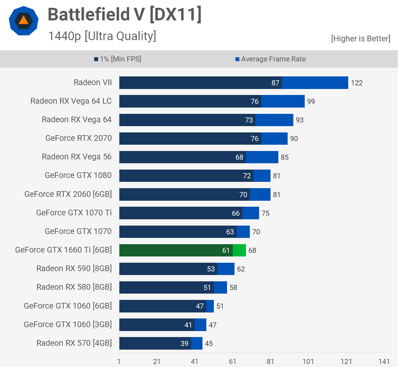 Nos tests mis à jour pour Battlefield V ont permis à la GTX 1660 Ti d’arriver juste derrière la GTX 1070 en 1080p, mais avec 90 images par seconde en moyenne, elle constituait une bonne avancée par rapport à la GTX 1060. Puis, à 1440p, nous constatons à peu près la même chose. Là, la 1660 Ti était légèrement plus lente que la GTX 1070, mais avec seulement 2 ips, vous pouvez facilement dire qu’elles ont fourni la même expérience. De plus, avec plus de 60 images par seconde restituées lors de notre test, le 1660 Ti offrait une performance hautement jouable dans Battlefield V à 1440p.