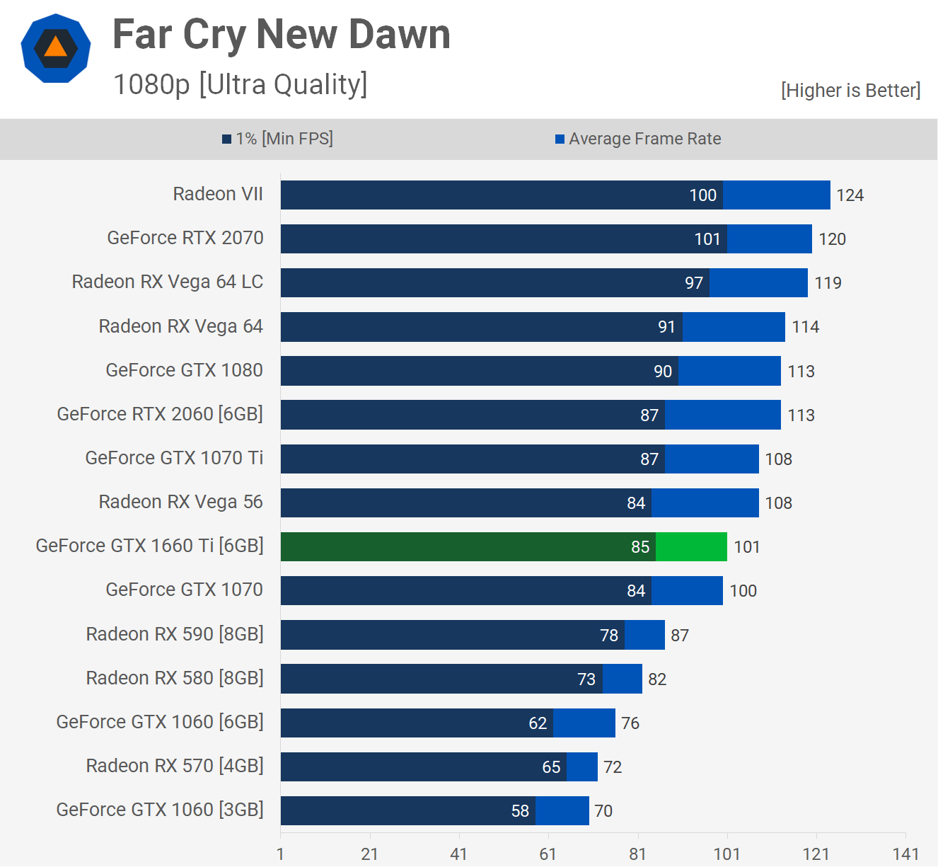 En terminant les points de repère du jeu, nous avons le nouveau titre Far Cry: New Dawn. Les résultats sont similaires à ce que nous avons vu dans Far Cry 5, ce à quoi on pouvait s’attendre puisque c’est le même monde et le même moteur de jeu. Ici, la 1660 Ti correspond à la GTX 1070, ce qui la rend un peu plus lente que la Vega 56.