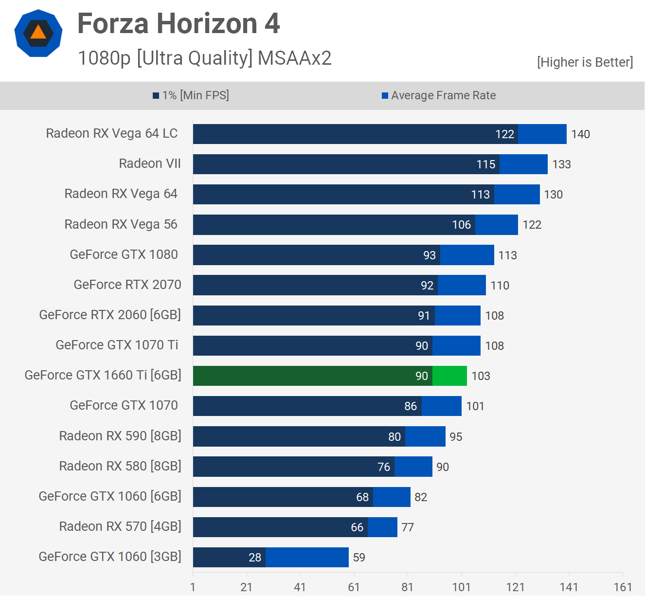 Forza Horizon 4 était en fait l'un des premiers jeux que nous avons comparé et nous avons été choqués de trouver la GTX 1660 Ti aussi proche de la RTX 2060. Nous avons déjà vu que les GPU Turing ne sont pas beaucoup plus rapides que leurs homologues Pascal dans ce titre, et dans le cas du RTX 2070, il est en fait un peu plus lent que le 1080.