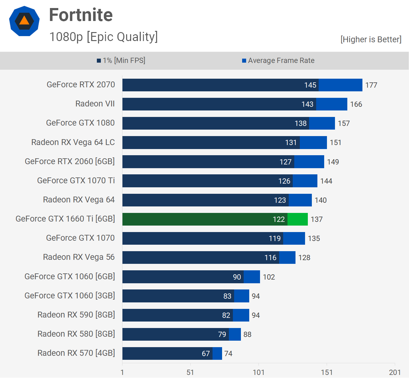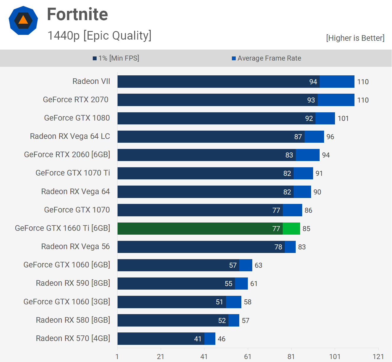 La GTX 1660 Ti sera sans aucun doute un choix populaire parmi les joueurs Fortnite. C’est de loin le moyen le moins coûteux de dépasser les 100 ips en utilisant des réglages de haute qualité. Il se révèle également très performant à 1440p, dépassant largement les 70 ips tout au long de notre test. Une fois encore, vous recherchez une performance comparable à celle de la GTX 1070.