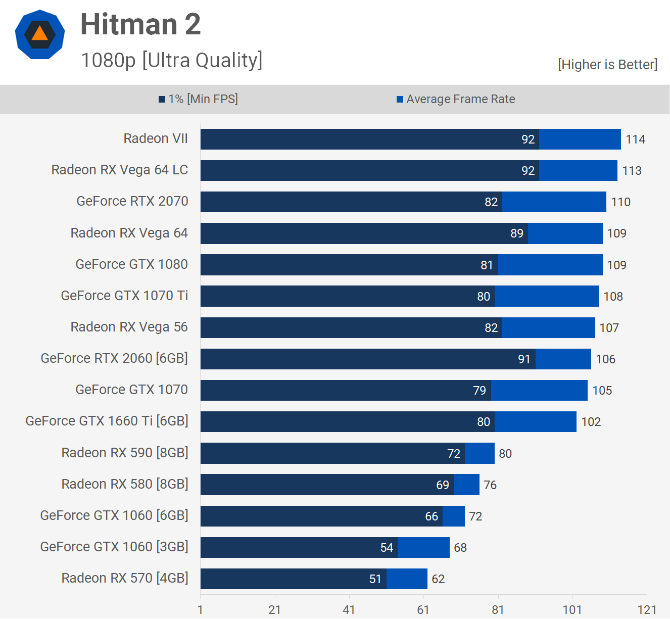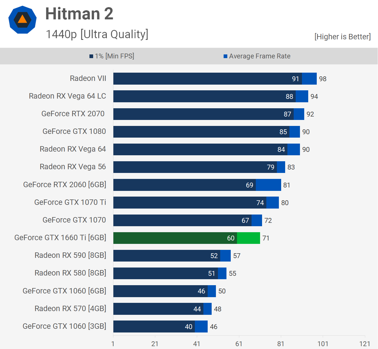 Hitman 2 est un peu étrange à 1080p parce que nous avons des problèmes de CPU à cette résolution. Le passage à 1440p nous donne une meilleure idée de la façon dont ces GPU se comparent. Nous voyons ici le 1660 Ti qui correspond à peu près à la GTX 1070, ce qui le rend à peine 12% plus lent que le RTX 2060.