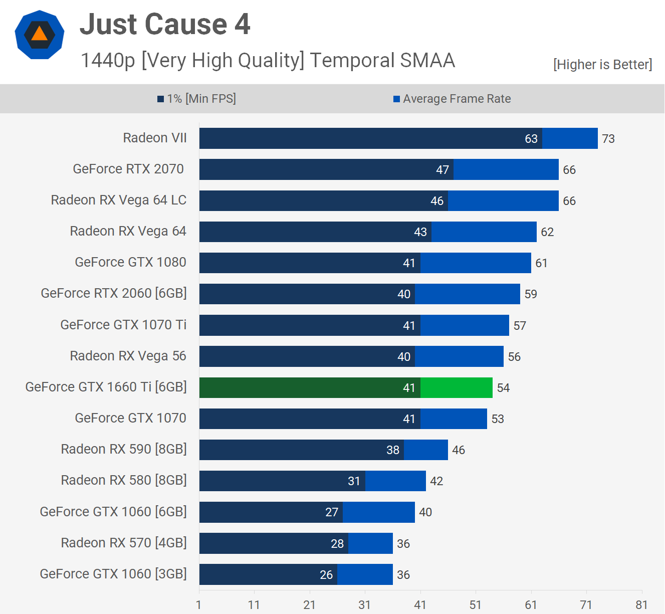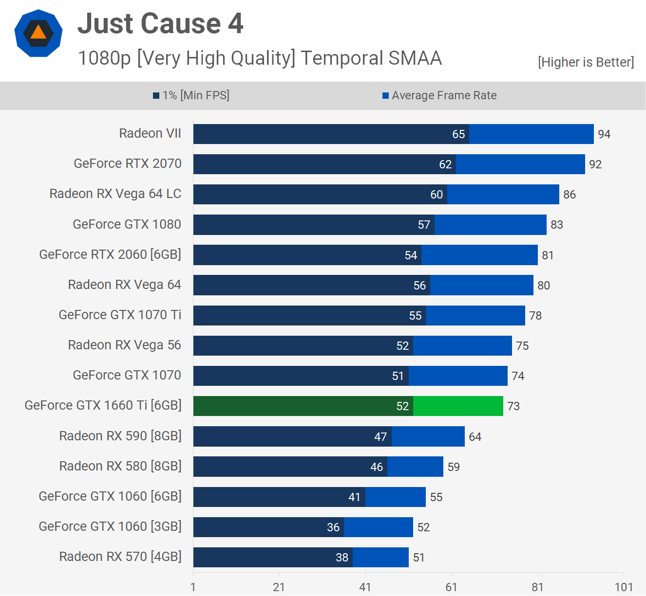 Maintenir des fréquences d'images supérieures à 60 ips dans Just Cause 4 n'est certes pas facile, mais la GTX 1660 Ti est désormais de loin le meilleur GPU à moins de 300 $ de ce titre, avec une moyenne de 73 ips en 1080p, soit 14% plus rapide que le RX. 590.