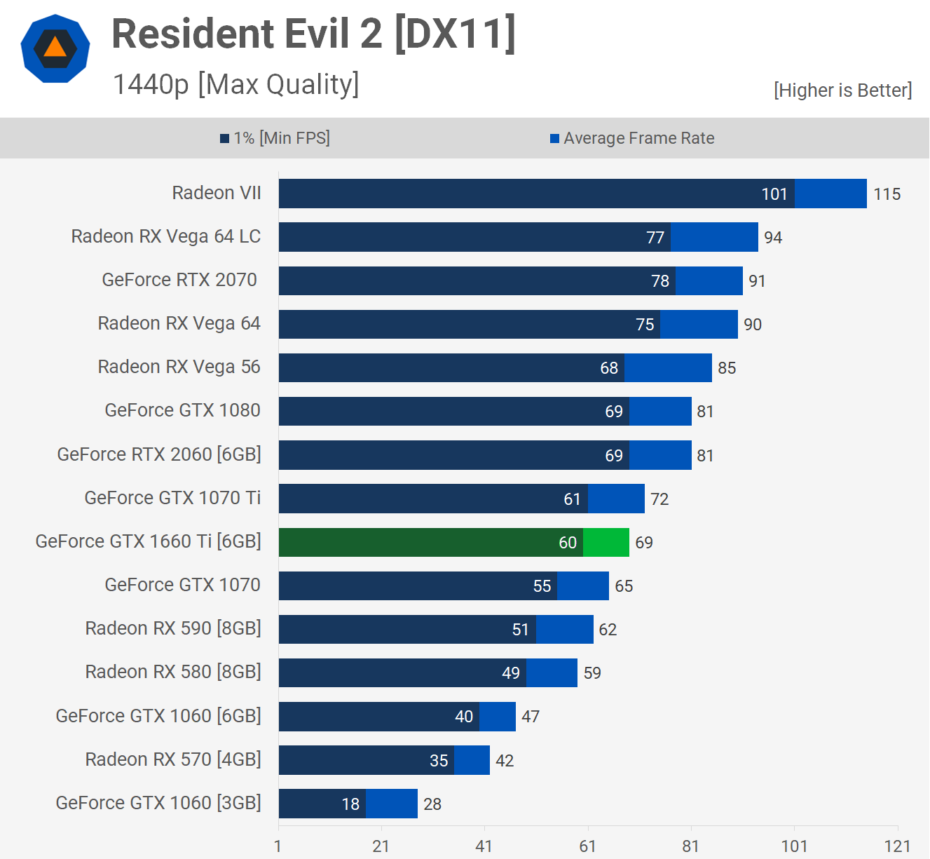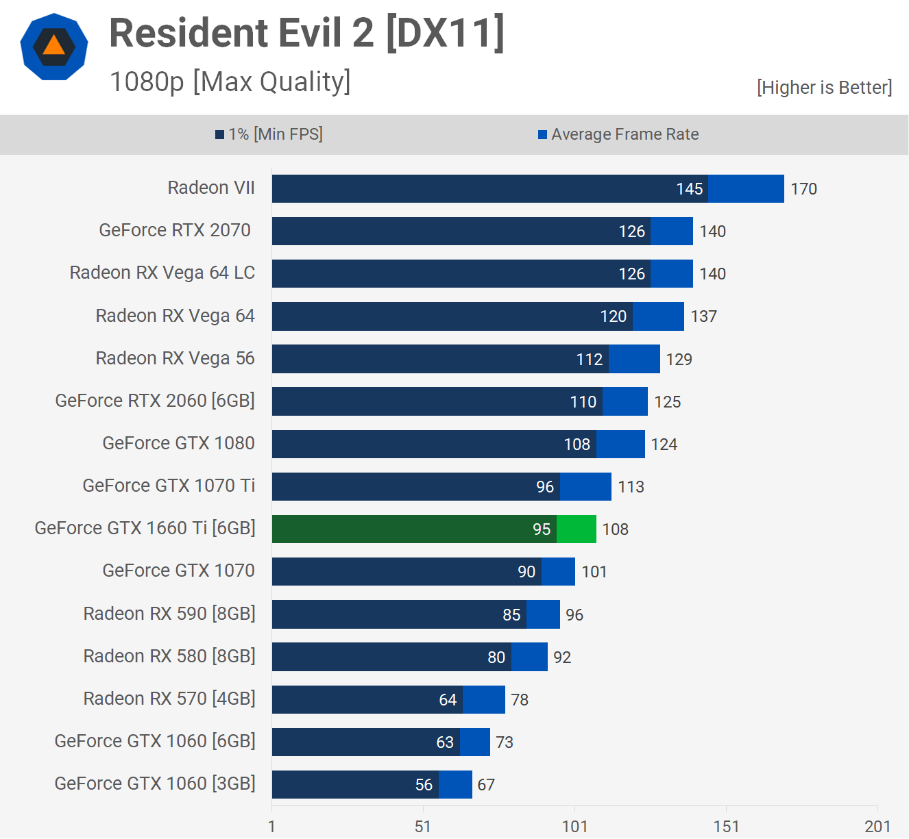 La GTX 1660 Ti battait Resident Evil 2 avec une impressionnante moyenne de 108 images par seconde, ce qui la plaçait entre 1070 et 1070 Ti, donc un résultat solide. Il a maintenu cette position à 1440p et dans un titre solide pour AMD, il était toujours 11% plus rapide que la Radeon RX 590, un autre résultat très solide pour le nouveau GPU à moins de 300 $ de Nvidia.