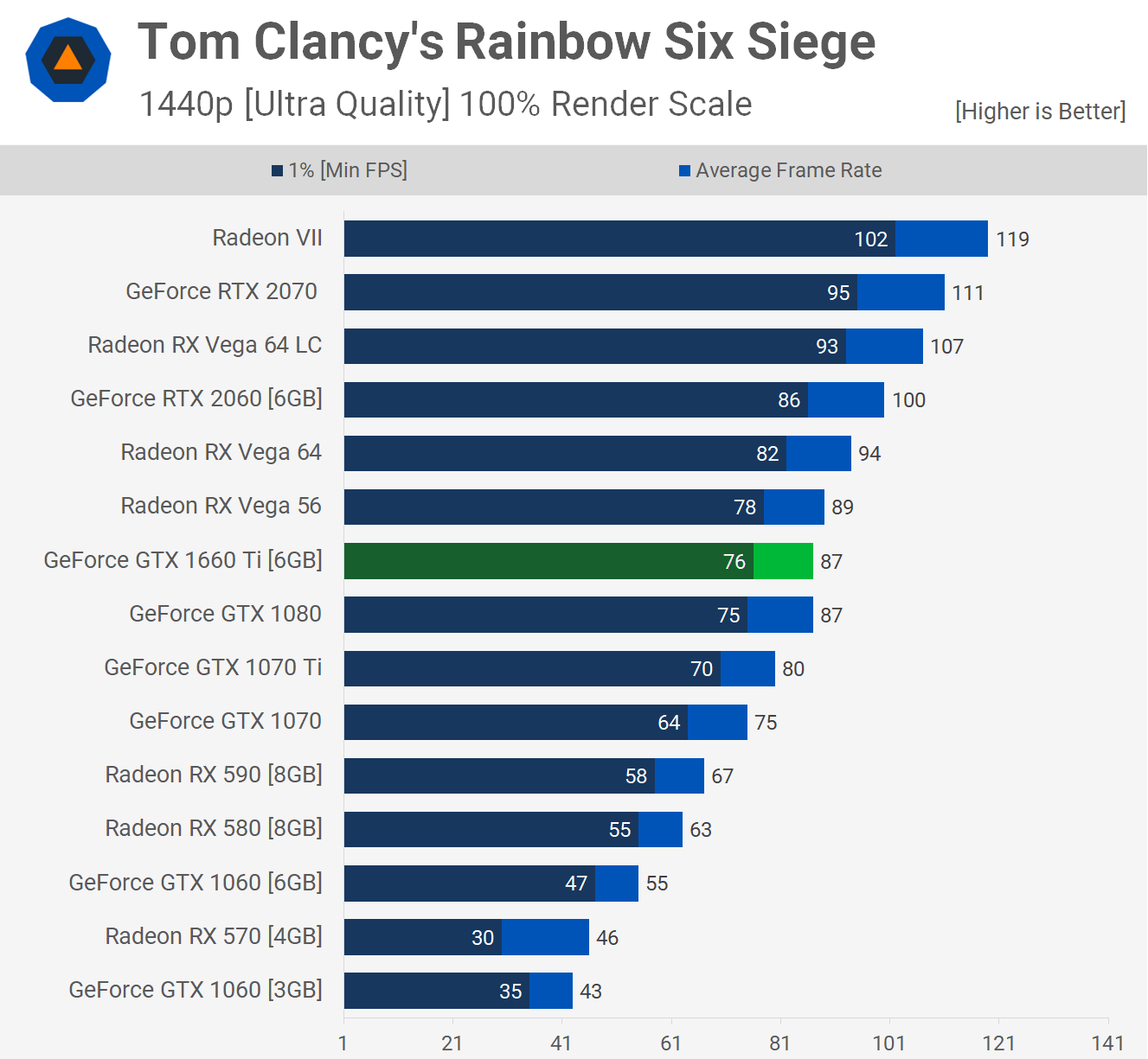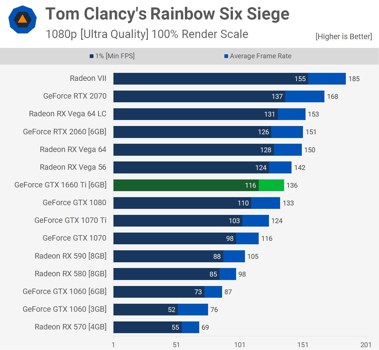 Rainbow Six Siege nous fournit toujours des résultats intéressants et l’examen d’aujourd’hui ne fait pas exception. La GTX 1660 Ti a en grande partie reflété les performances de la GTX 1070, mais ici, elle la brise et parvient à égaliser la GTX 1080.