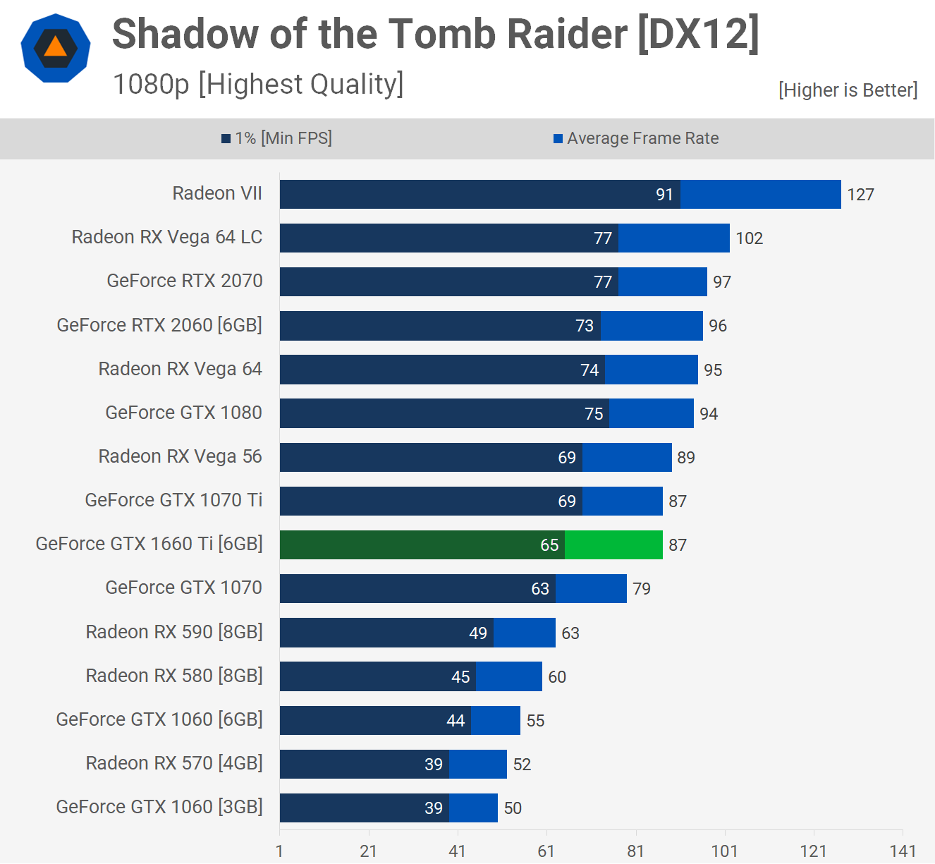 Tout d’abord, nous avons Shadow of the Tomb Raider. Ici, la GTX 1660 Ti est impressionnante. Elle correspond à la GTX 1070 Ti avec 87 images par seconde en moyenne à 1080p. Cela lui a permis d’égaler Vega 56 et donc de détruire le RX 590 de près de 40%. Il est également mortel à 1440p, égalant à nouveau la GTX 1070 Ti et battant le RX 590 avec une impressionnante marge de 41%.