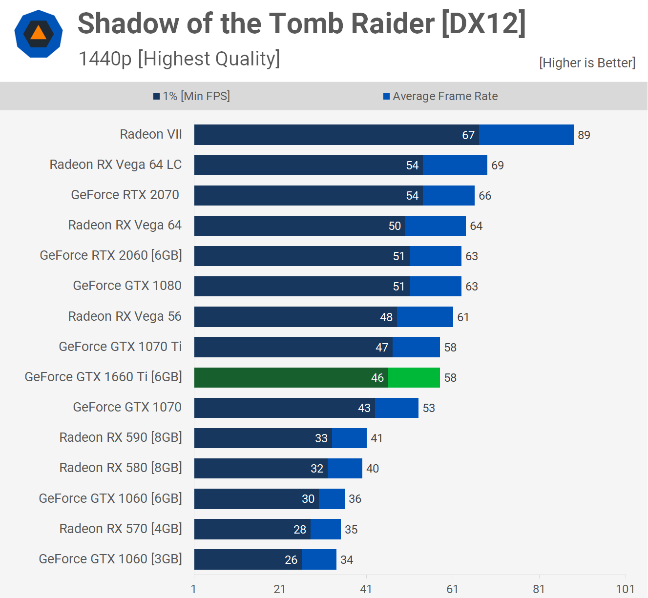 Passant à 1440p, la 1660 Ti se situe entre les 1070 Ti et Vega 56, ce qui la rend 9% plus rapide que la vanilla 1070 et 55% plus rapide que la 6 Go GTX 1060.