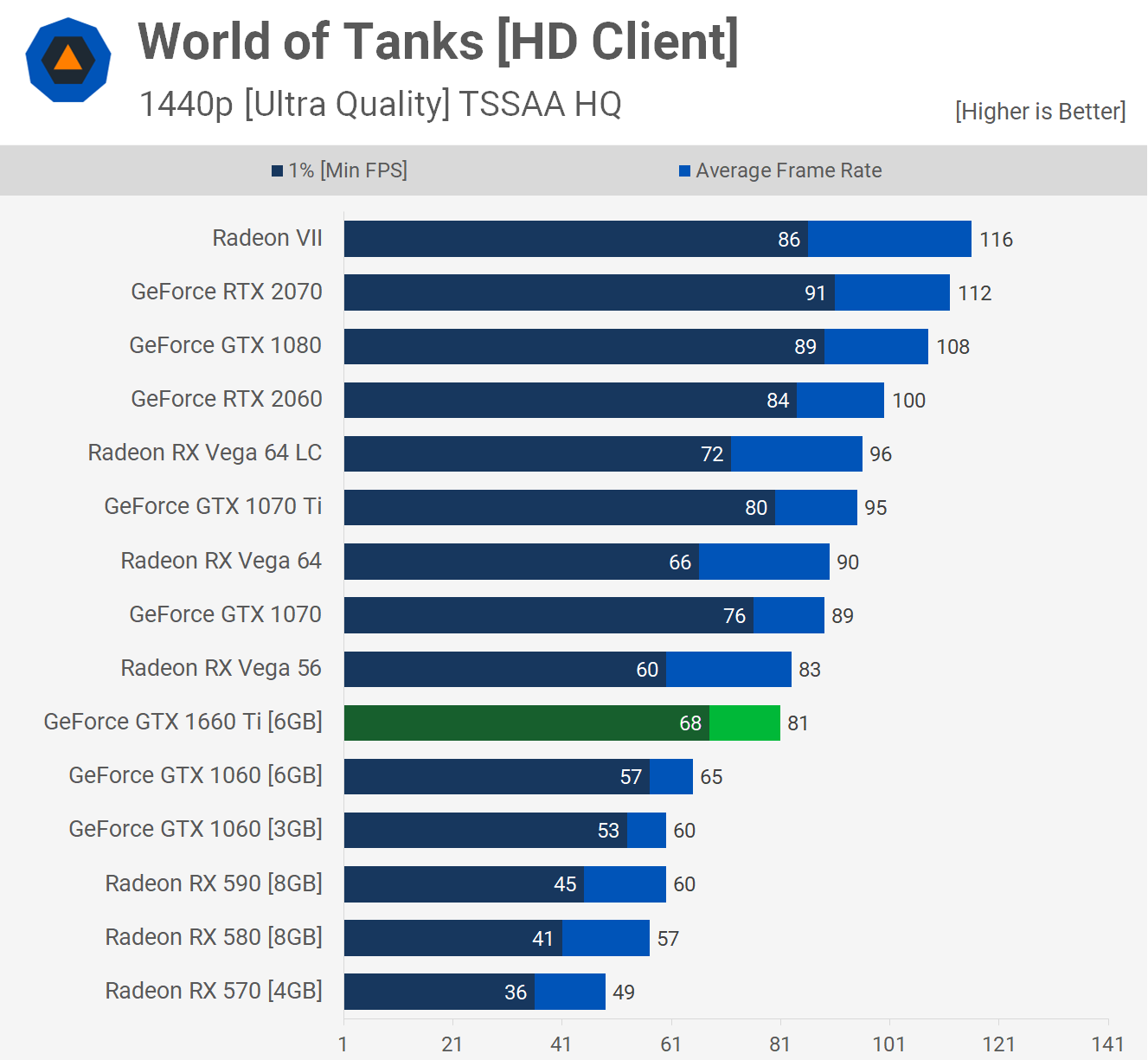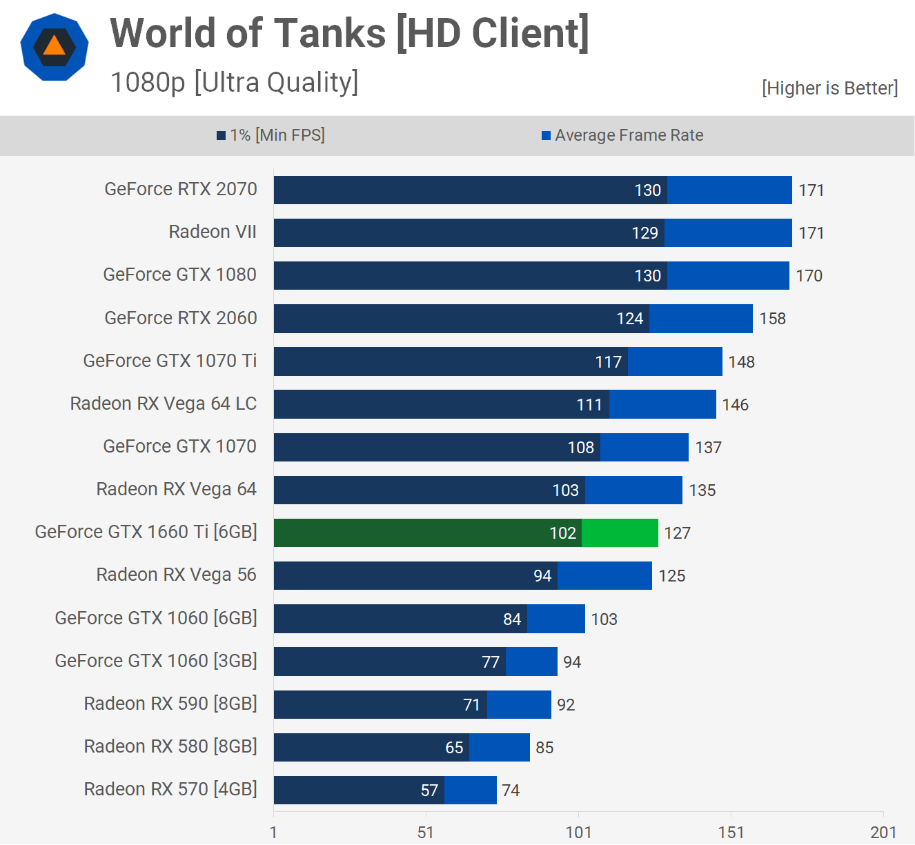 Il est intéressant de noter que la GTX 1660 Ti n’a pas pu égaler la GTX 1070 dans World of Tanks en 1080p, où elle ralentissait de 7%. Un résultat rare du nouveau GPU Turing arrivant derrière le 1070. Il a toutefois réussi à battre le Vega 56 et était presque 40% plus rapide que le RX 590.