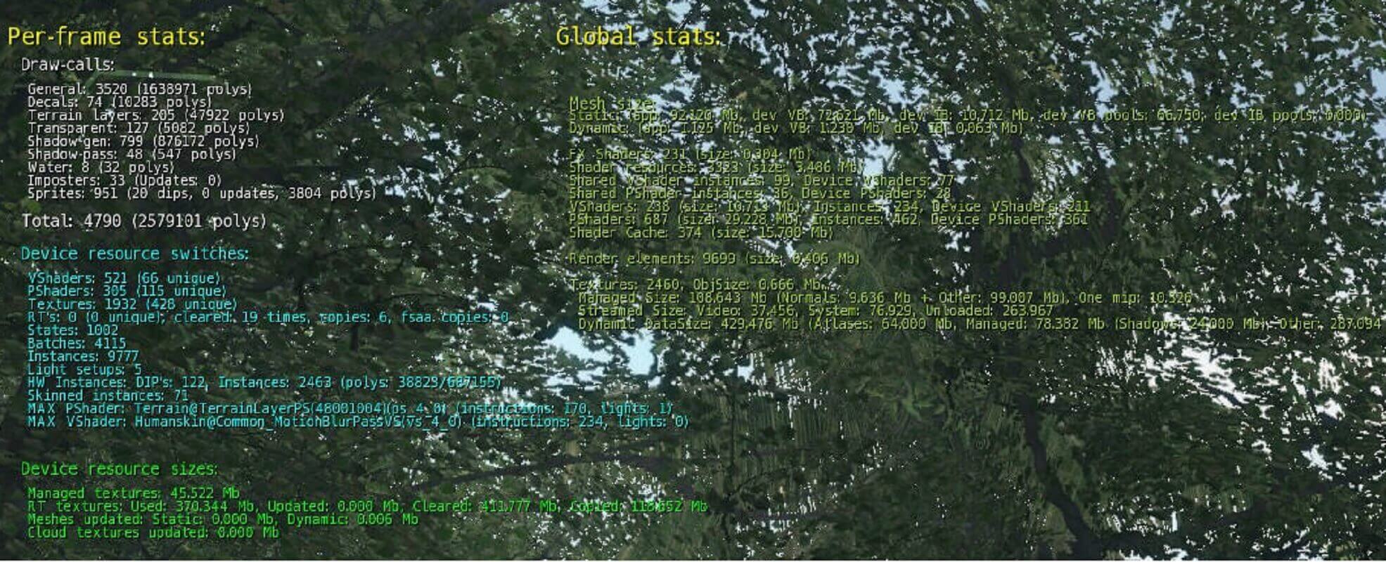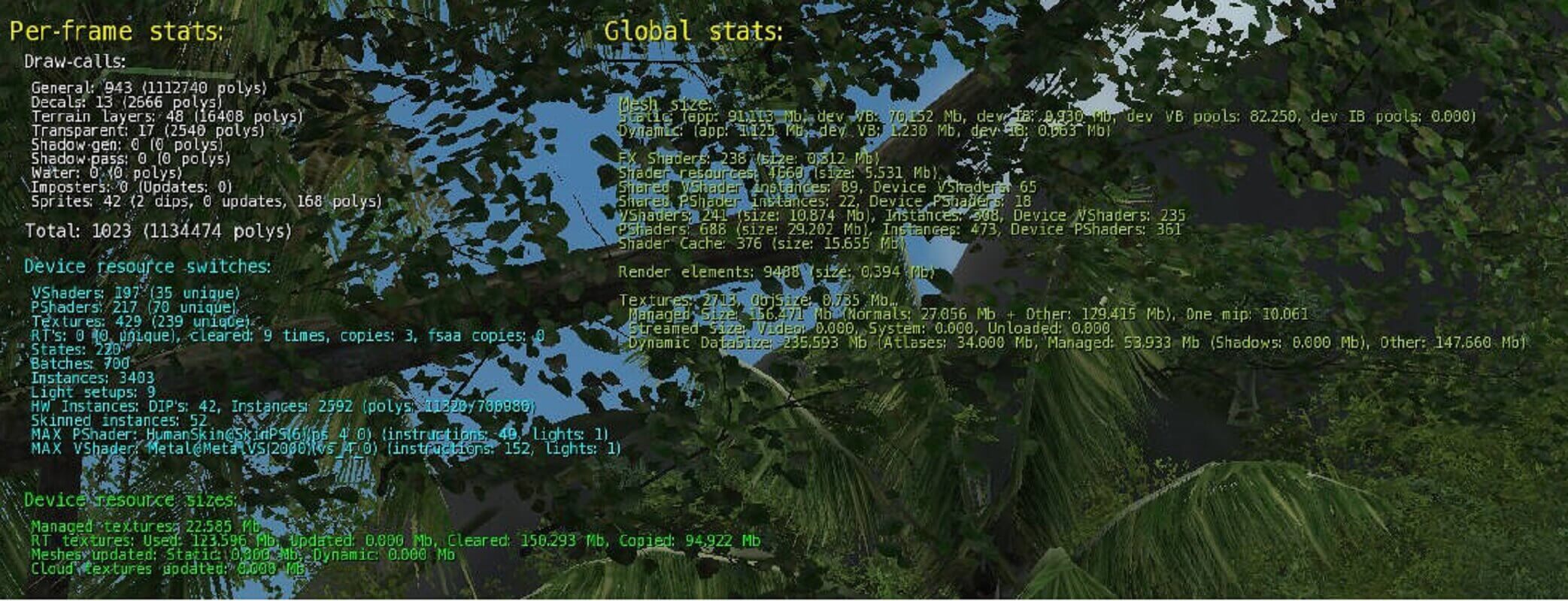 le DP La figure nous indique combien de fois un matériau ou un effet visuel différent a été «appelé» pour les objets du cadre. Une commande de console utile est r_stats – il fournit une ventilation des appels de dessin, ainsi que des shaders utilisés, des détails sur la façon dont la géométrie est gérée et la charge de texture dans la scène.