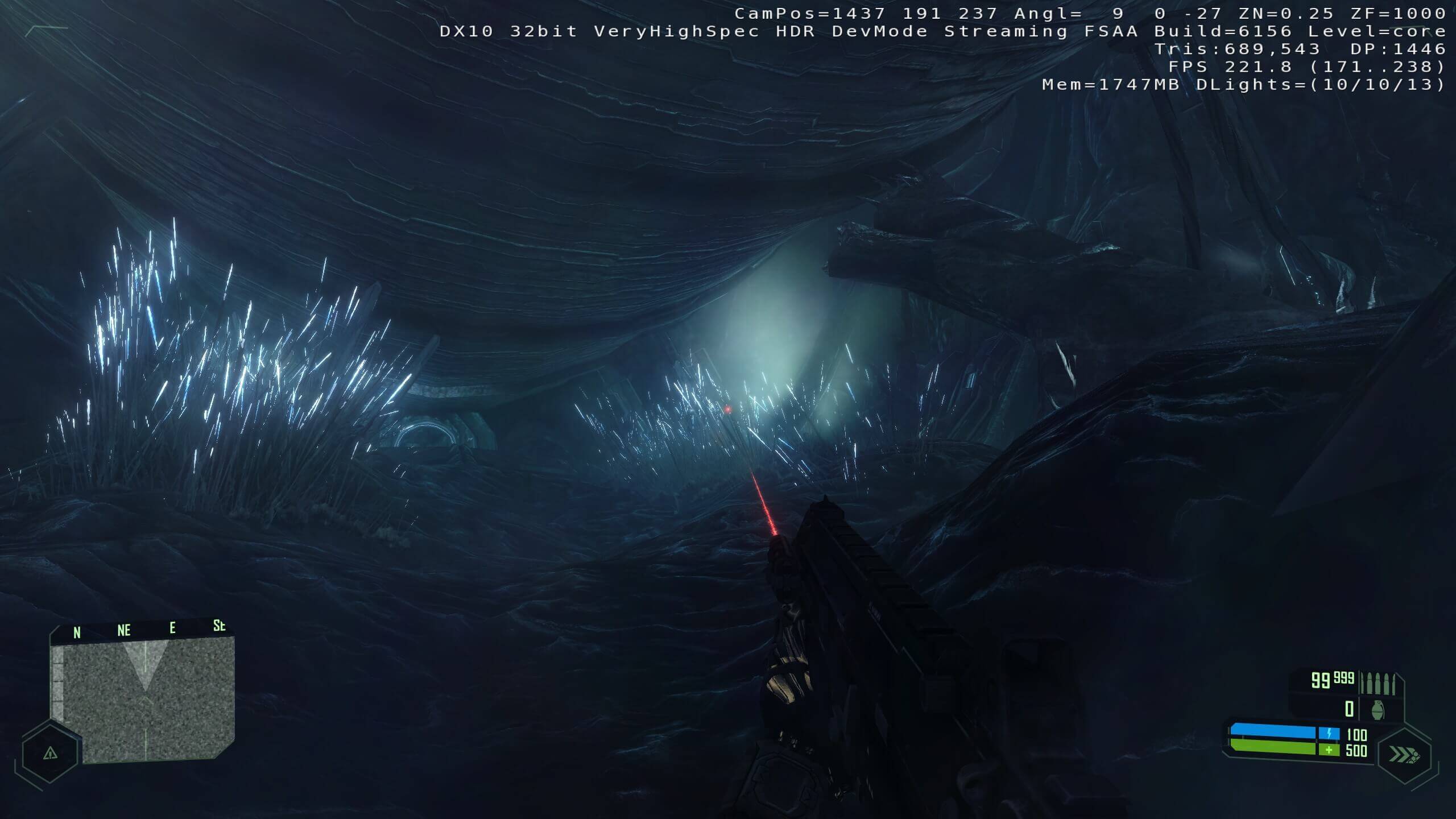 Ce n'est donc pas vraiment un cas que Crysis ne supporte pas correctement le multithreading, comme il le fait clairement avec les limitations de DirectX; ce sont plutôt les choix de conception faits pour le rendu (par exemple, les arbres modélisés avec précision, les environnements dynamiques et destructibles) qui sont responsables des baisses de performances. Vous vous souvenez de l'image du jeu prise dans une grotte, plus tôt dans cet article? Notez que le chiffre DP était inférieur à 2000, alors regardez le compteur FPS.