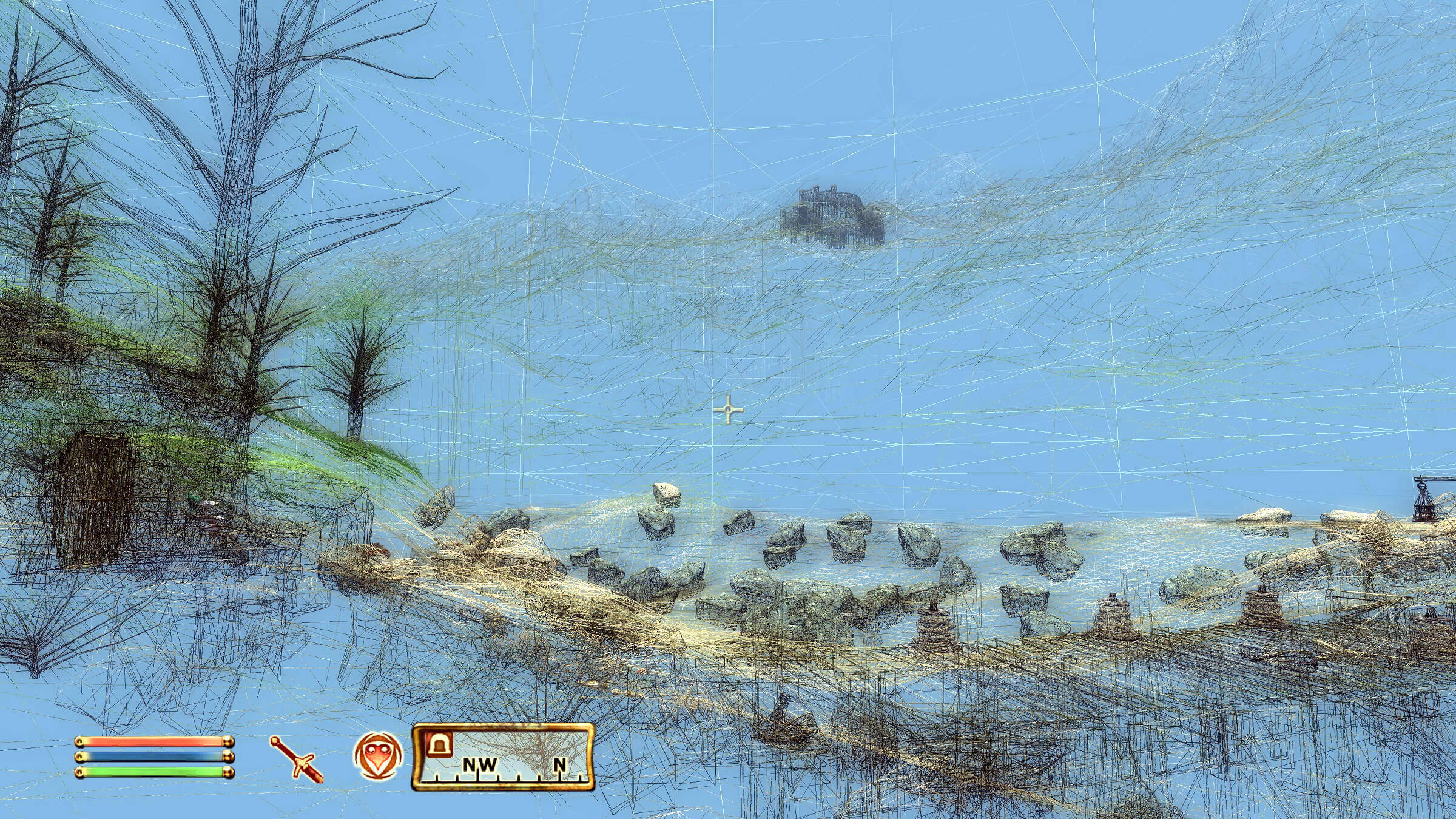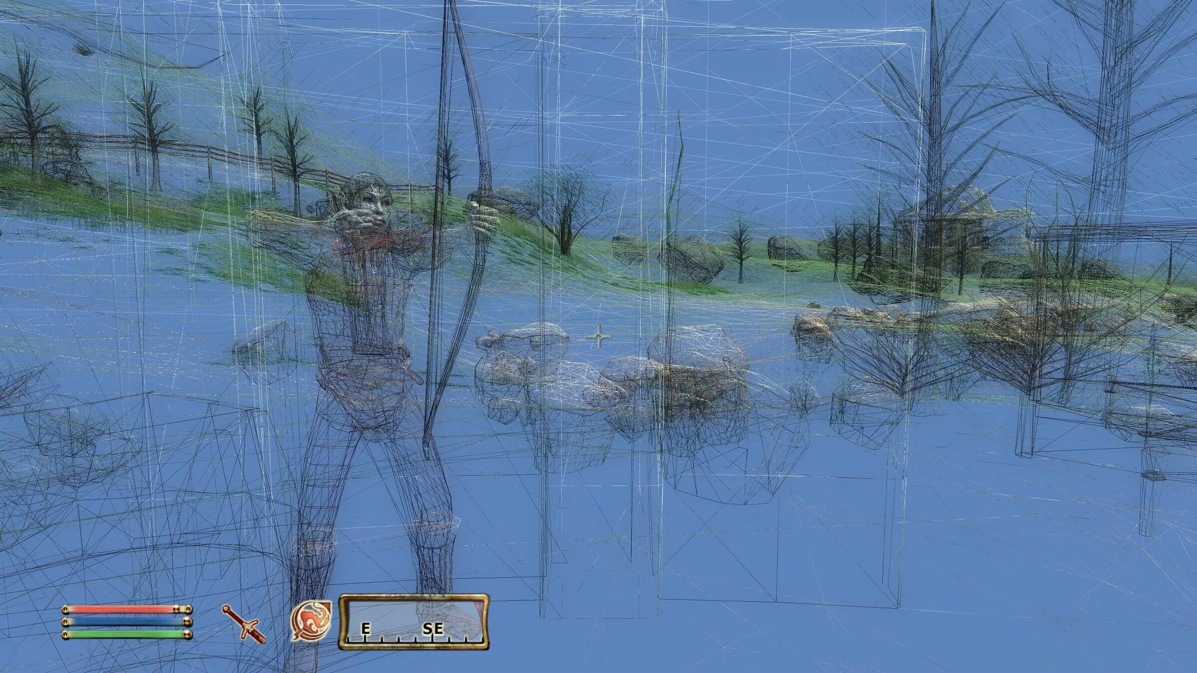 En regardant une autre scène Oblivion en mode filaire (sans textures), on voit des arbres composés de plusieurs centaines de triangles au maximum. Les feuilles et l'herbe ne sont que de simples textures, avec des régions transparentes pour donner l'impression que chaque brin de feuillage est un élément discret.