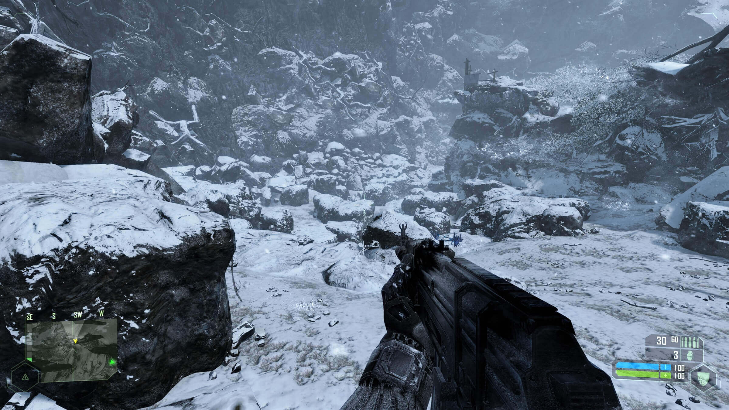 Une fois sorti du système de grottes, il est temps de traverser une section gelée de l'île, avec des batailles intenses et une autre fonctionnalité de gameplay standard: une mission d'escorte. Pour le rendu de la neige et de la glace, les développeurs de Crytek ont effectué quatre révisions, le réduisant très près de certaines échéances de production internes.
