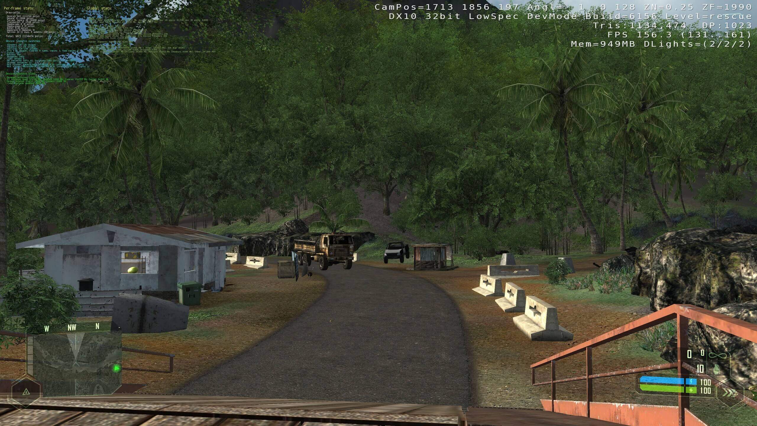 Alors, que se passait-il exactement pour rendre le jeu si exigeant en matériel? Nous pouvons avoir une idée de ce qui se passe dans les coulisses en exécutant le titre avec «devmode» activé. Cette option ouvre la console pour permettre à toutes sortes d'ajustements et de triches d'être activés, et elle fournit une superposition dans le jeu, remplie d'informations de rendu.