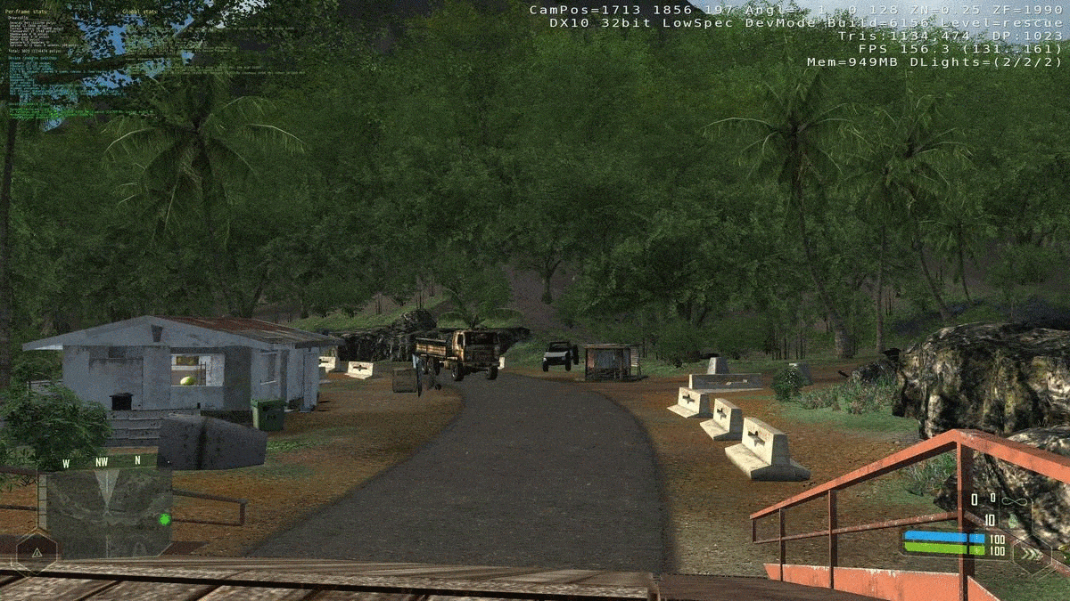 Dans l'image ci-dessus, prise relativement tôt dans le jeu, vous pouvez voir la fréquence d'images moyenne et la quantité de mémoire système utilisée. Les valeurs étiquetées Tris, DP, et DLights affiche le nombre de triangles par image, le nombre d'appels de dessin par image et le nombre de lumières directionnelles (et dynamiques) utilisées.