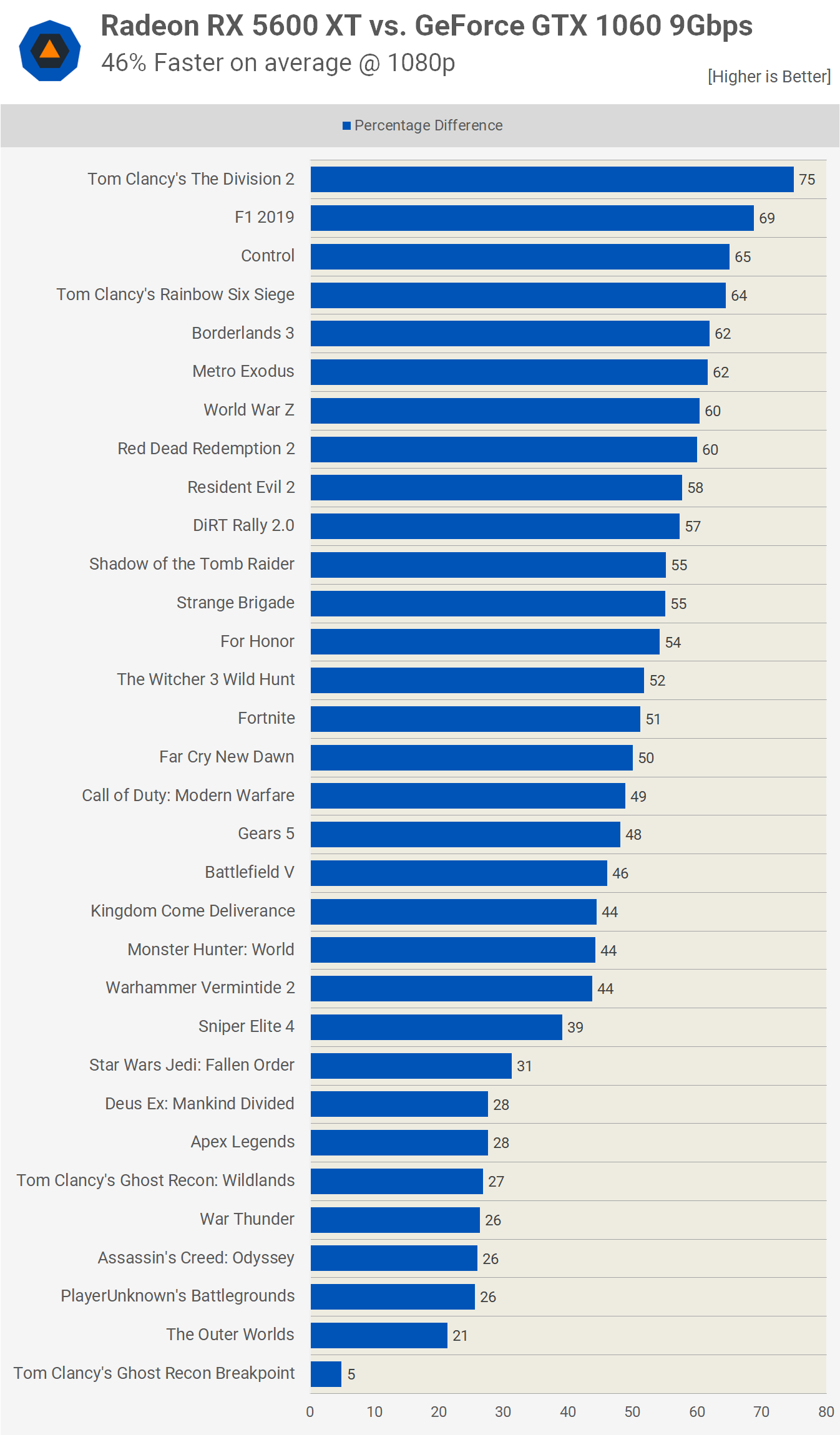Il y a 8 titres où la Radeon 5600 XT a été plus rapide d'une marge de 60% ou plus avec 8 autres titres où elle n'a été plus rapide que de 31% ou moins, à l'exception de la valeur aberrante Breakpoint. Si vous jouez principalement à PUBG, par exemple, la mise à niveau du GTX 1060 vers le 5600 XT n'en vaudra pas la peine, vous feriez mieux de regarder le RTX 2060 dans ce cas.