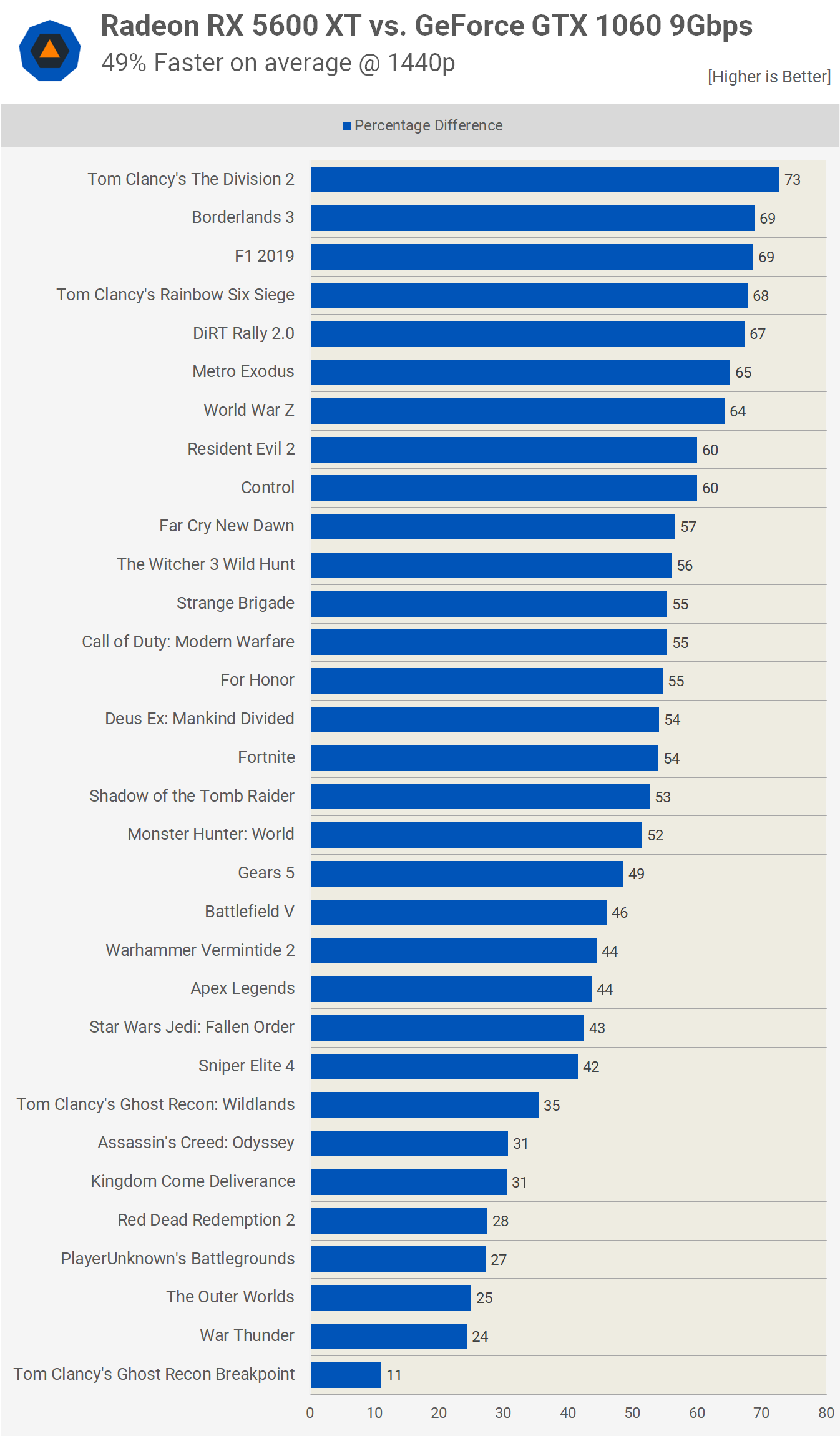 Avec un si grand nombre de jeux testés, nous pouvons facilement conclure que la Radeon RX 5600 XT est ~ 50% plus rapide que la GTX 1060, ce qui en fait un choix de mise à niveau solide pour la plupart des joueurs. La mise en garde à la règle dépendra des jeux auxquels vous jouez le plus, que vous pouvez voir par vous-même en utilisant les graphiques ci-dessus.