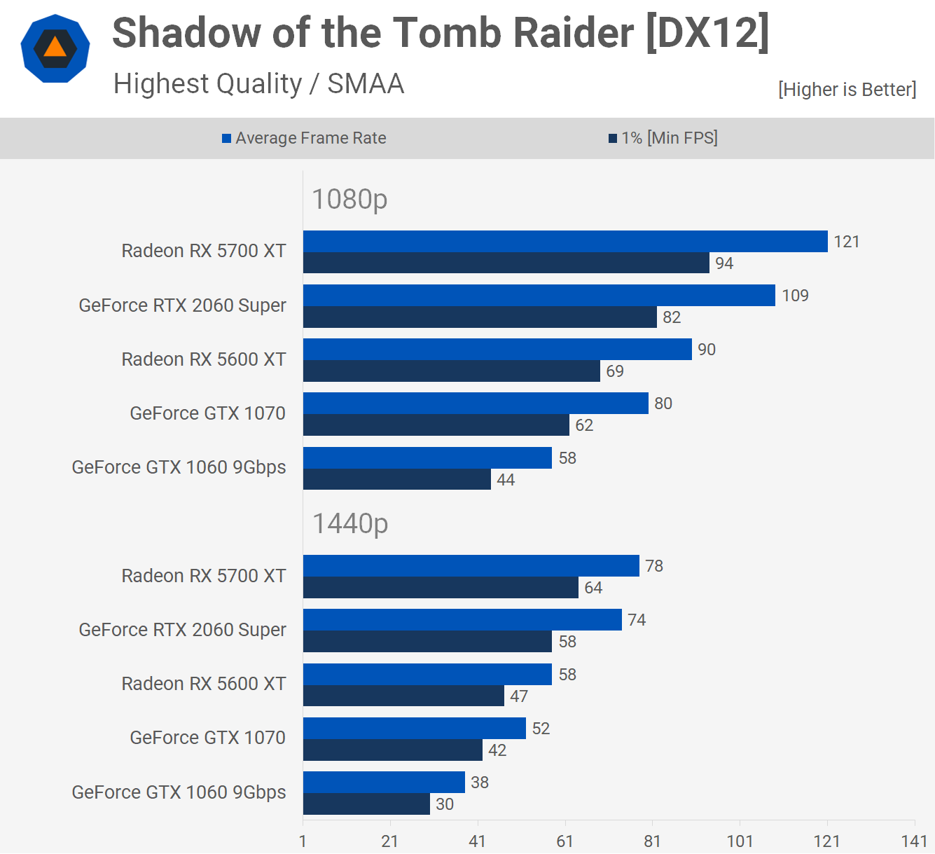 En règle générale, les GPU Radeon fonctionnent bien dans Shadow of the Tomb Raider et le 5600 XT ne fait pas exception. Ici, il était 55% plus rapide que le GTX 1060 à 1080p et 53% plus rapide à 1440p. Des gains solides dans tous les domaines.