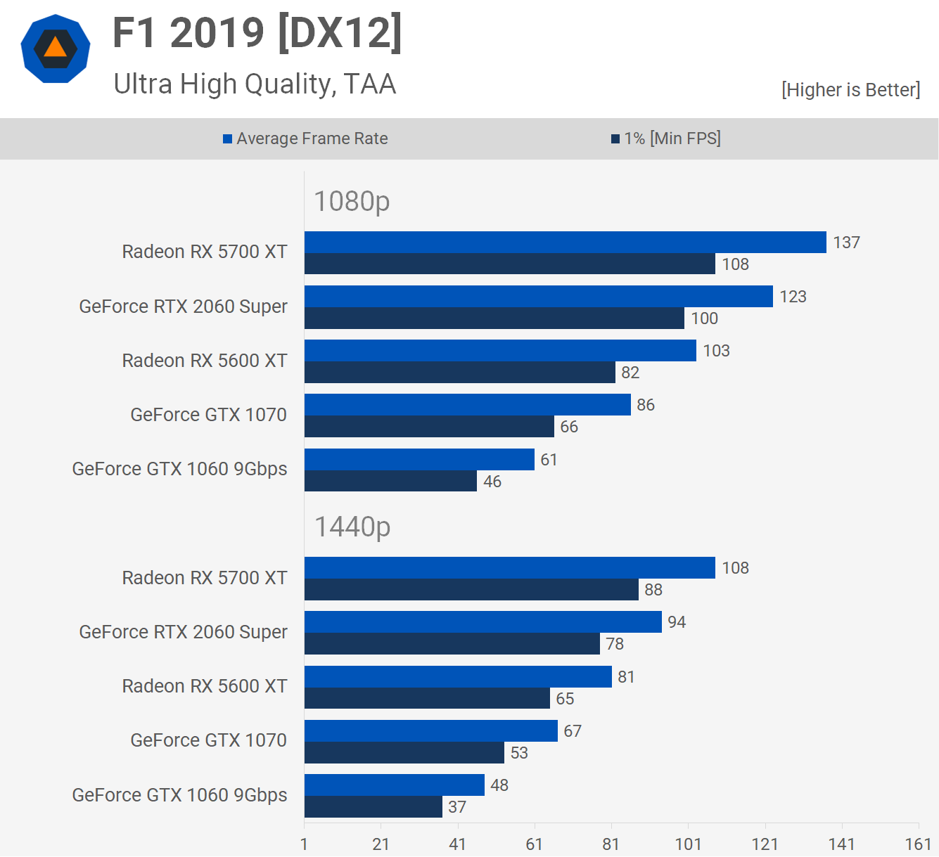 F1 2019 est un autre titre où la Radeon 5600 XT s'est très bien comportée. Ici, il a dépassé la GTX 1070 d'une marge de 20% à 1080p. Cela a permis au GPU Radeon de fournir près de 70% de cadres de plus que le GTX 1060, donc une mise à niveau massive pour les fans de F1. Les marges étaient sensiblement les mêmes à 1440p.