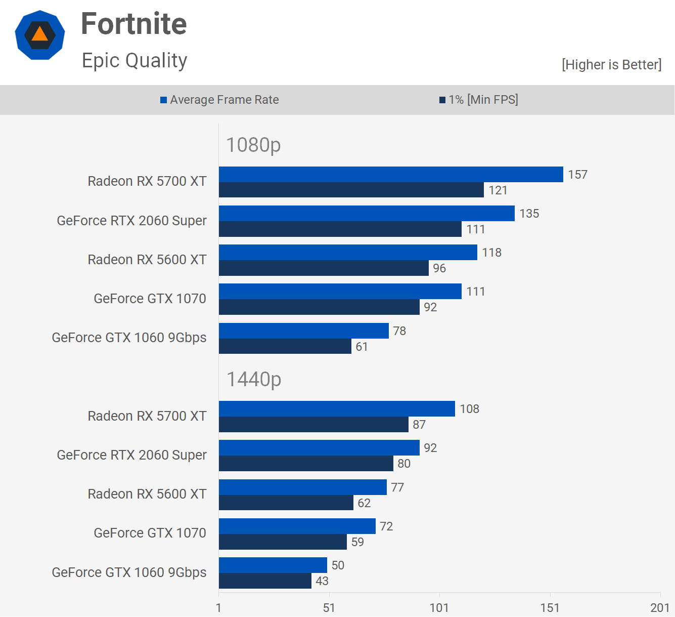 En testant avec Fortnite, le 5600 XT a de nouveau dépassé le GTX 1070, mais seulement avec une marge de 6%. En battant la GTX 1070, cela signifie également qu'elle était un peu plus rapide que la 1060, augmentant les fréquences d'images de 51% à 1080p.