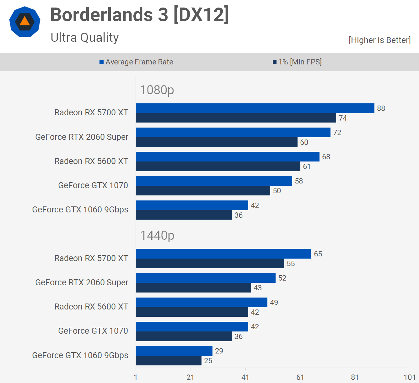 Le dernier ensemble de résultats dont nous allons discuter en détail provient de Borderlands 3. Nous voyons de très bonnes performances du 5600 XT: à 1080p, il écrase la GTX 1060 d'une marge de 62% puis presque de 70% à 1440p.