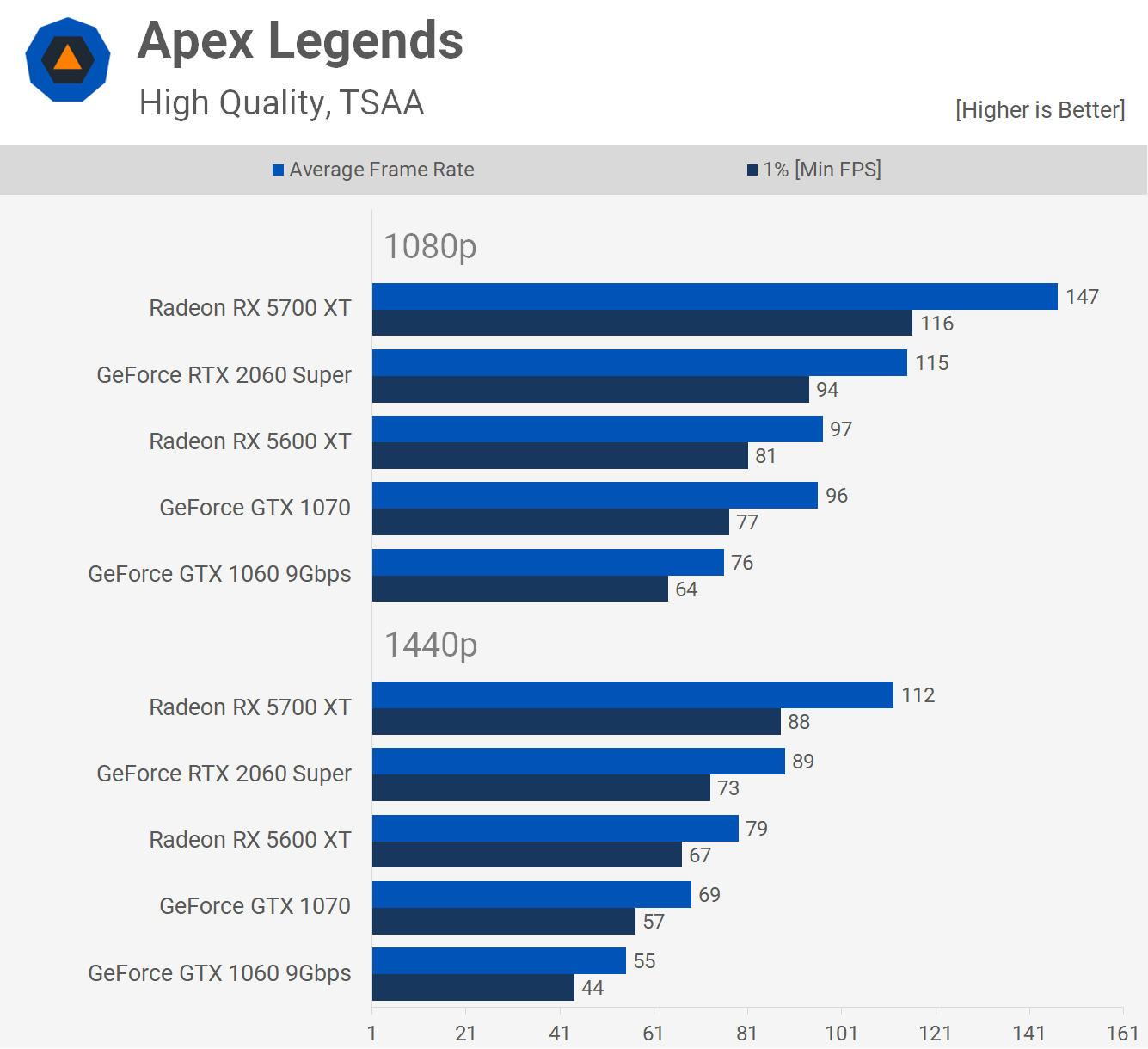 Nos tests Apex Legends Saison 4 montrent que le 5600 XT correspond au GTX 1070 à 1080p, mais le bat avec une marge de 14% à 1440p, ce qui est intéressant. La GTX 1060 fonctionne également étonnamment bien, à 1080p, le 5600 XT était juste 28% plus rapide, bien que cette marge ait été étendue à 44% à 1440p.