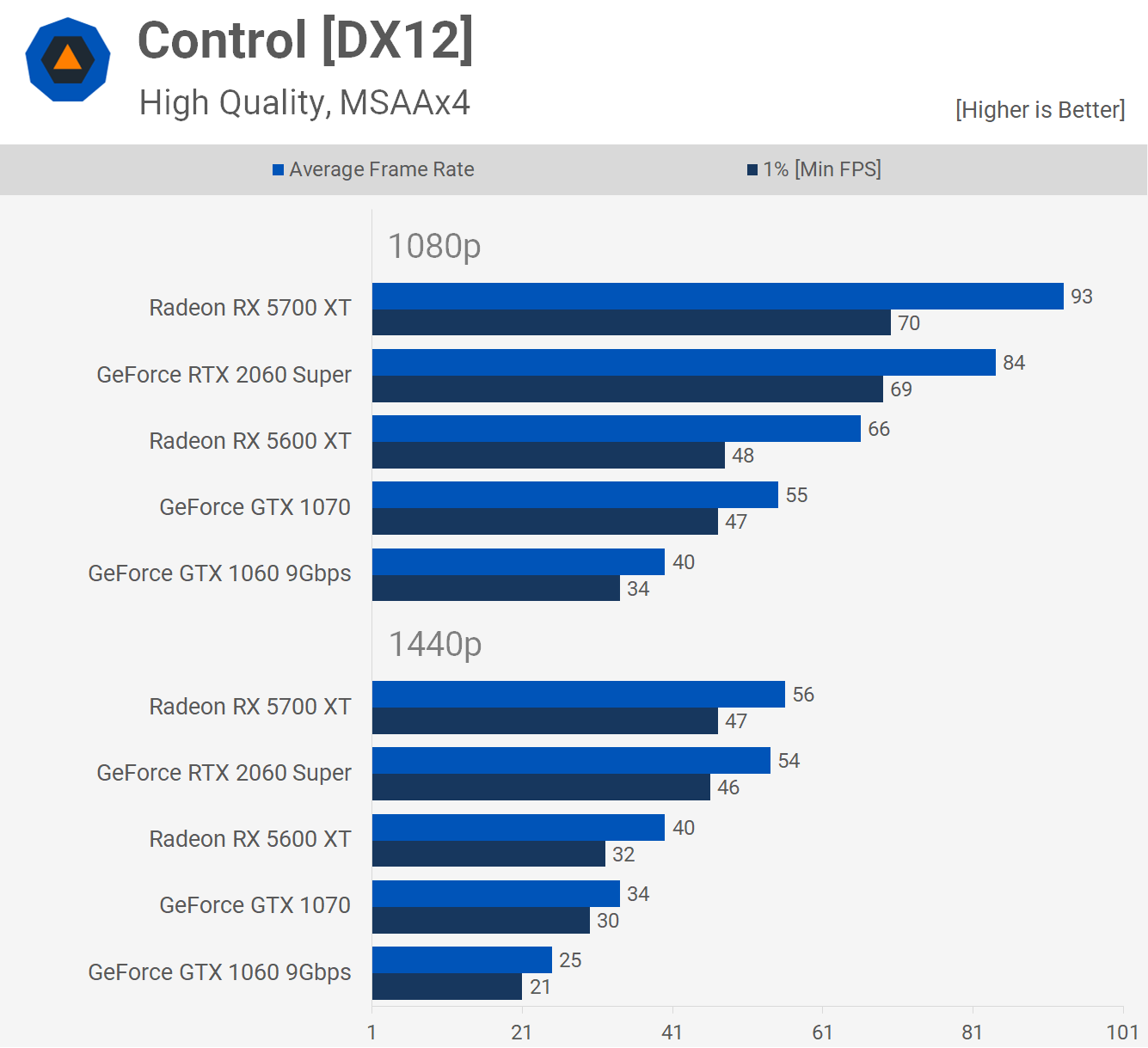 La Radeon 5600 XT était 20% plus rapide que la GTX 1070 en contrôle à 1080p, bien que les deux offrent des performances similaires de 1%. Cela signifiait toujours que le GPU basé sur Navi était entre 41 et 65% plus rapide que le GTX 1060, donc une amélioration des performances plutôt importante. Les gains étaient très similaires à la fois en 1080p et en 1440p.