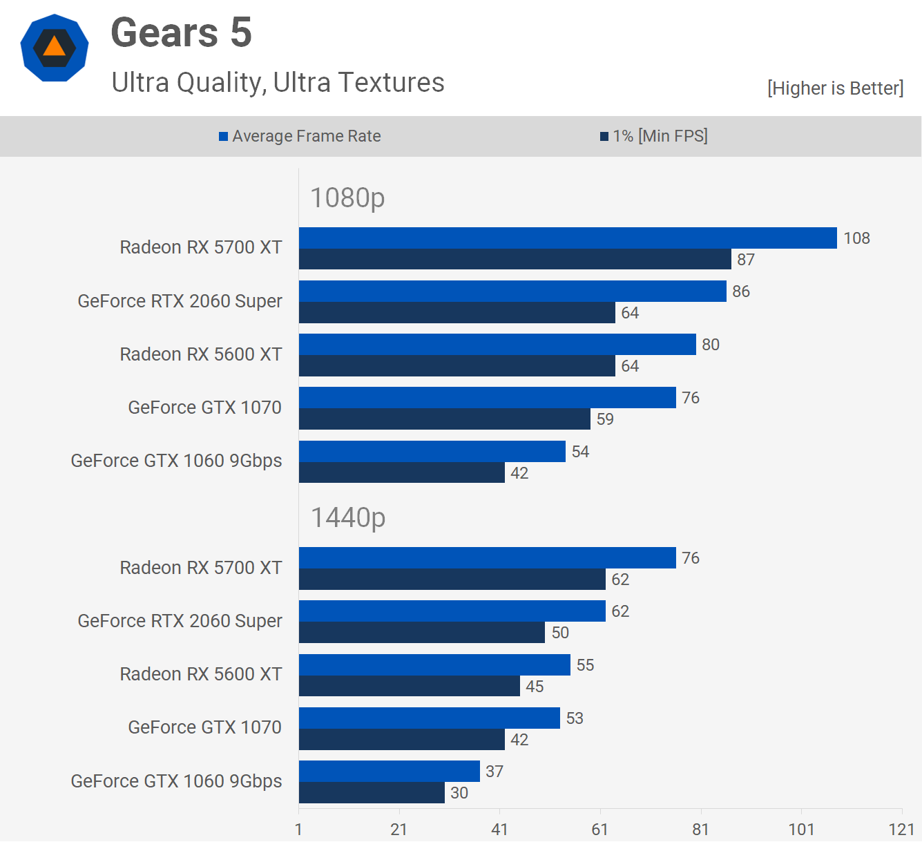 Les marges de performance dans Gears 5 sont similaires à celles des derniers jeux que nous avons examinés. Le 5600 XT devance le GTX 1070 pour battre le 1060 par une marge convaincante de 48% à 1080p et 49% à 1440p.